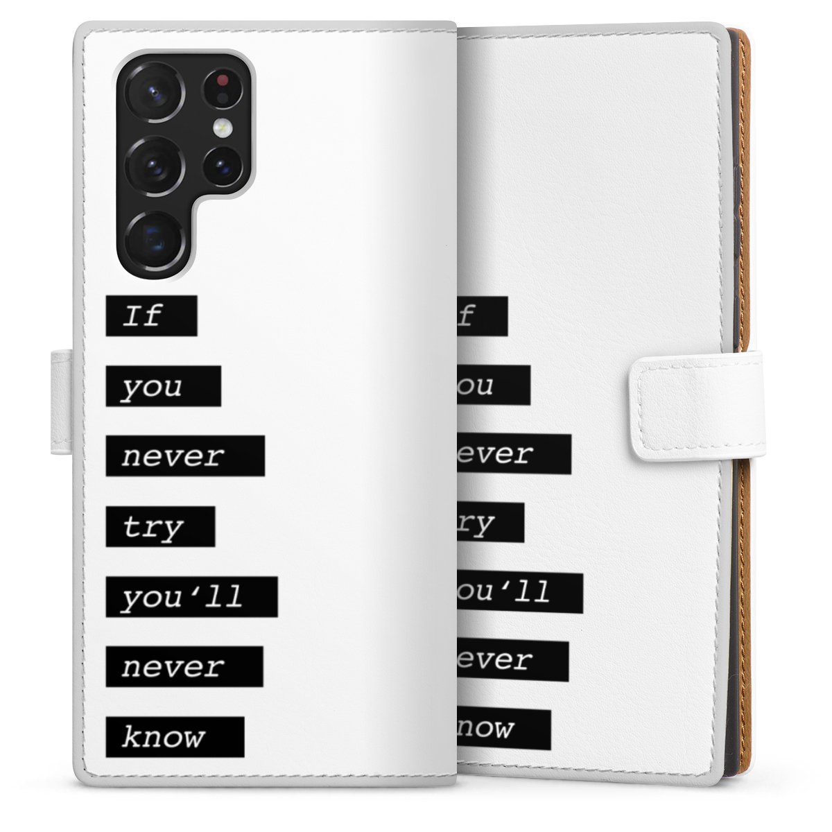 For our Sideflip Case we are using our advanced direct printing technology. The back and frontside are fully printabale, the inside of the phone bag is left unprinted. You can order the phone case without print, printed completely or also with a partial print.