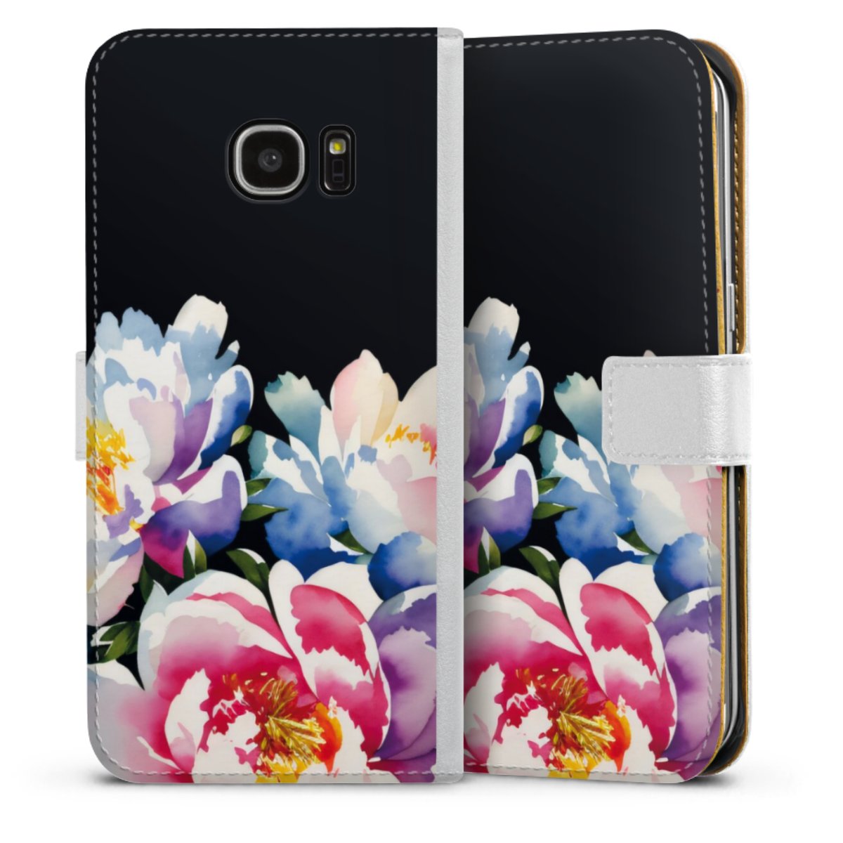 For our Sideflip Case we are using our advanced direct printing technology. The back and frontside are fully printabale, the inside of the phone bag is left unprinted. You can order the phone case without print, printed completely or also with a partial print.