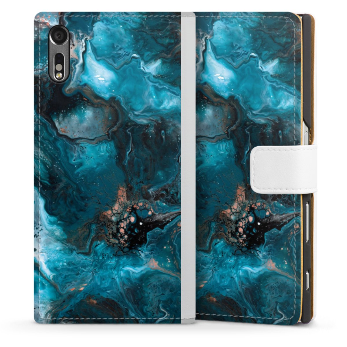 For our Sideflip Case we are using our advanced direct printing technology. The back and frontside are fully printabale, the inside of the phone bag is left unprinted. You can order the phone case without print, printed completely or also with a partial print.