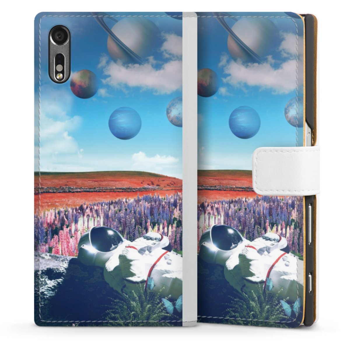 For our Sideflip Case we are using our advanced direct printing technology. The back and frontside are fully printabale, the inside of the phone bag is left unprinted. You can order the phone case without print, printed completely or also with a partial print.