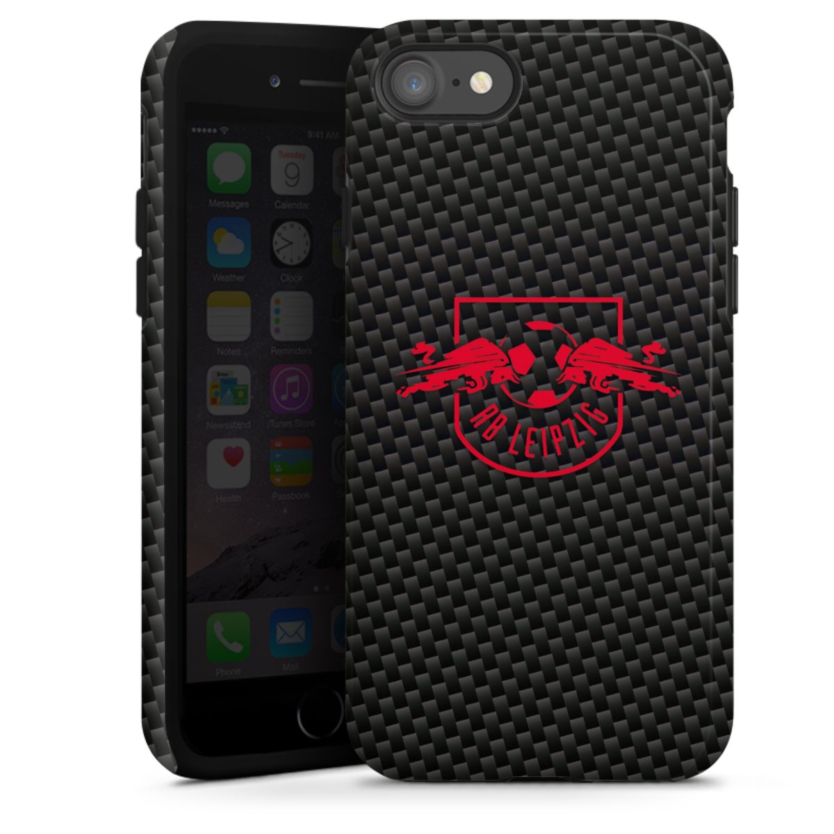 Red RB Leipzig logo on carbon look