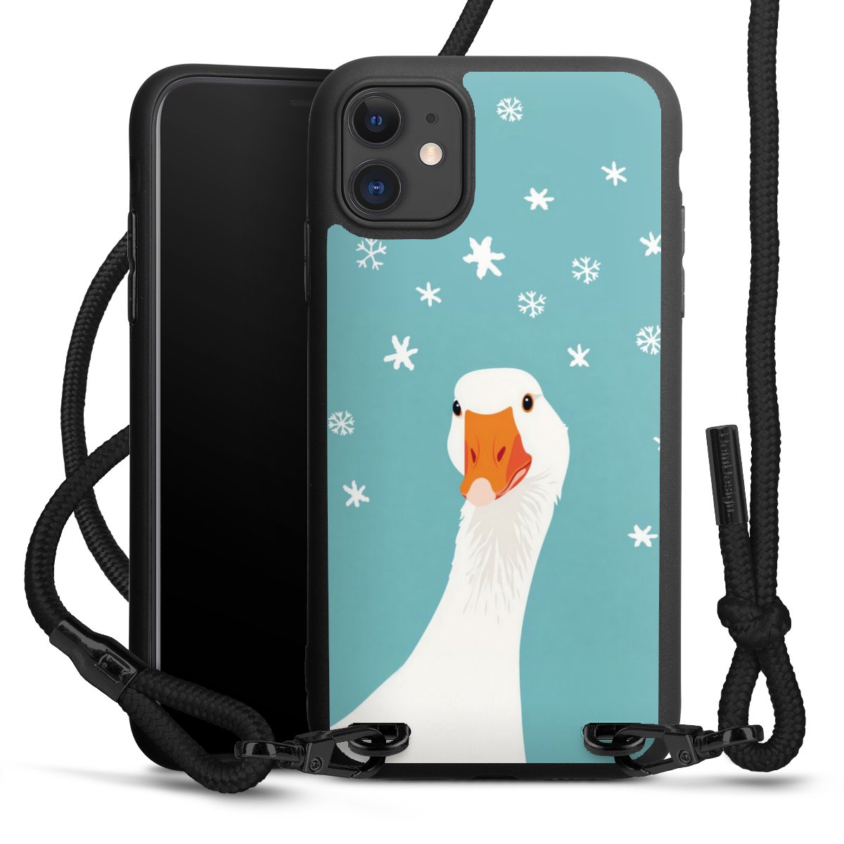 The matt black silicone case is made of flexible TPU (thermoplastic polyurethane) and offers robust protection. The durable, unbreakable material makes the cover flexible and dimensionally stable at the same time. The matte surface makes your design stand out more and is less susceptible to fingerprints and dirt. The stylish trend accessory fits comfortably in the hand and is perfectly complemented by the fabric (polyester) mobile phone strap. The braided fabric strap is approx. 1.70 metres long with a diameter of approx. 0.5 cm. Due to the special knotting technique, the length of the strap can be adjusted by simply pulling it, so that you can adapt it individually to your wishes. The practical case to wear around your neck is available with the fabric strap in black. As a little icing on the cake, we have provided the strap with a chic metal fastener in matt black. The strap is securely fastened to the case with loops made of high-quality genuine leather and press studs. The ends of the fabric strap are covered with metallic end caps and thus protected from fraying.