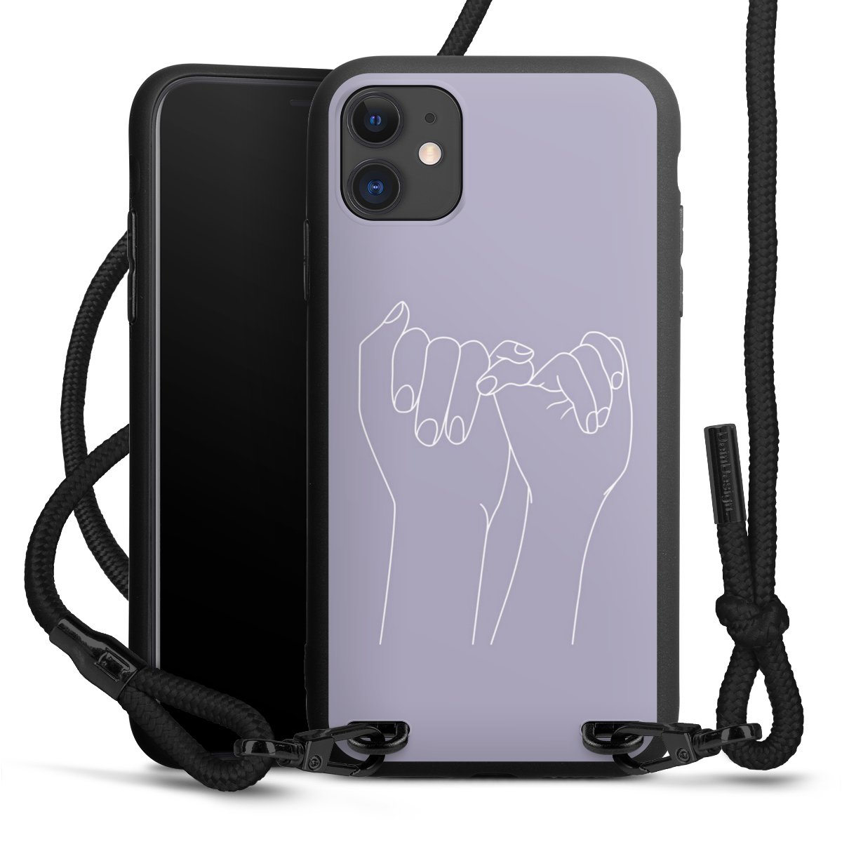 The matt black silicone case is made of flexible TPU (thermoplastic polyurethane) and offers robust protection. The durable, unbreakable material makes the cover flexible and dimensionally stable at the same time. The matte surface makes your design stand out more and is less susceptible to fingerprints and dirt. The stylish trend accessory fits comfortably in the hand and is perfectly complemented by the fabric (polyester) mobile phone strap. The braided fabric strap is approx. 1.70 metres long with a diameter of approx. 0.5 cm. Due to the special knotting technique, the length of the strap can be adjusted by simply pulling it, so that you can adapt it individually to your wishes. The practical case to wear around your neck is available with the fabric strap in black. As a little icing on the cake, we have provided the strap with a chic metal fastener in matt black. The strap is securely fastened to the case with loops made of high-quality genuine leather and press studs. The ends of the fabric strap are covered with metallic end caps and thus protected from fraying.