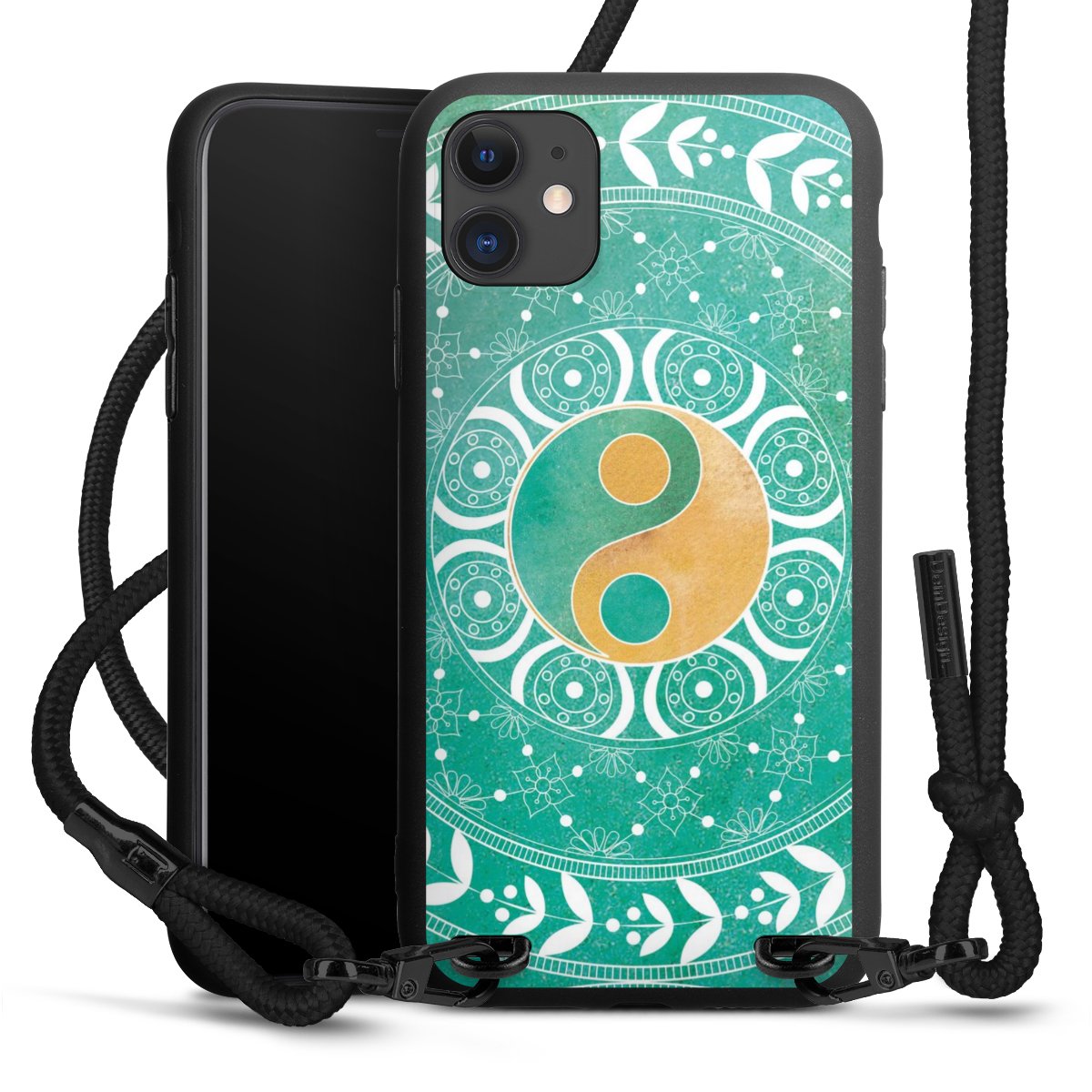 The matt black silicone case is made of flexible TPU (thermoplastic polyurethane) and offers robust protection. The durable, unbreakable material makes the cover flexible and dimensionally stable at the same time. The matte surface makes your design stand out more and is less susceptible to fingerprints and dirt. The stylish trend accessory fits comfortably in the hand and is perfectly complemented by the fabric (polyester) mobile phone strap. The braided fabric strap is approx. 1.70 metres long with a diameter of approx. 0.5 cm. Due to the special knotting technique, the length of the strap can be adjusted by simply pulling it, so that you can adapt it individually to your wishes. The practical case to wear around your neck is available with the fabric strap in black. As a little icing on the cake, we have provided the strap with a chic metal fastener in matt black. The strap is securely fastened to the case with loops made of high-quality genuine leather and press studs. The ends of the fabric strap are covered with metallic end caps and thus protected from fraying.