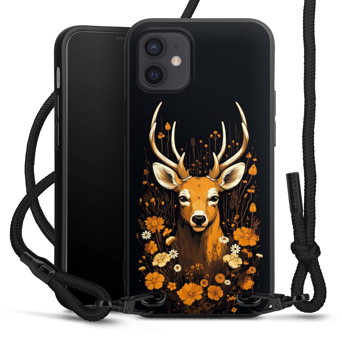The matt black silicone case is made of flexible TPU (thermoplastic polyurethane) and offers robust protection. The durable, unbreakable material makes the cover flexible and dimensionally stable at the same time. The matte surface makes your design stand out more and is less susceptible to fingerprints and dirt. The stylish trend accessory fits comfortably in the hand and is perfectly complemented by the fabric (polyester) mobile phone strap. The braided fabric strap is approx. 1.70 metres long with a diameter of approx. 0.5 cm. Due to the special knotting technique, the length of the strap can be adjusted by simply pulling it, so that you can adapt it individually to your wishes. The practical case to wear around your neck is available with the fabric strap in black. As a little icing on the cake, we have provided the strap with a chic metal fastener in matt black. The strap is securely fastened to the case with loops made of high-quality genuine leather and press studs. The ends of the fabric strap are covered with metallic end caps and thus protected from fraying.
