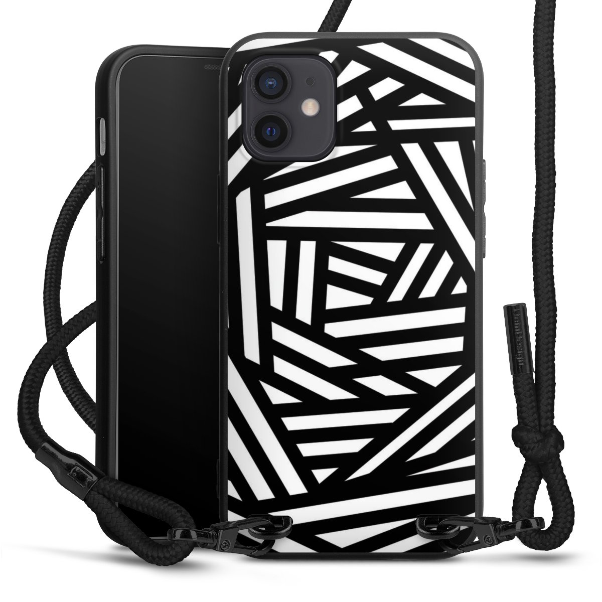 The matt black silicone case is made of flexible TPU (thermoplastic polyurethane) and offers robust protection. The durable, unbreakable material makes the cover flexible and dimensionally stable at the same time. The matte surface makes your design stand out more and is less susceptible to fingerprints and dirt. The stylish trend accessory fits comfortably in the hand and is perfectly complemented by the fabric (polyester) mobile phone strap. The braided fabric strap is approx. 1.70 metres long with a diameter of approx. 0.5 cm. Due to the special knotting technique, the length of the strap can be adjusted by simply pulling it, so that you can adapt it individually to your wishes. The practical case to wear around your neck is available with the fabric strap in black. As a little icing on the cake, we have provided the strap with a chic metal fastener in matt black. The strap is securely fastened to the case with loops made of high-quality genuine leather and press studs. The ends of the fabric strap are covered with metallic end caps and thus protected from fraying.
