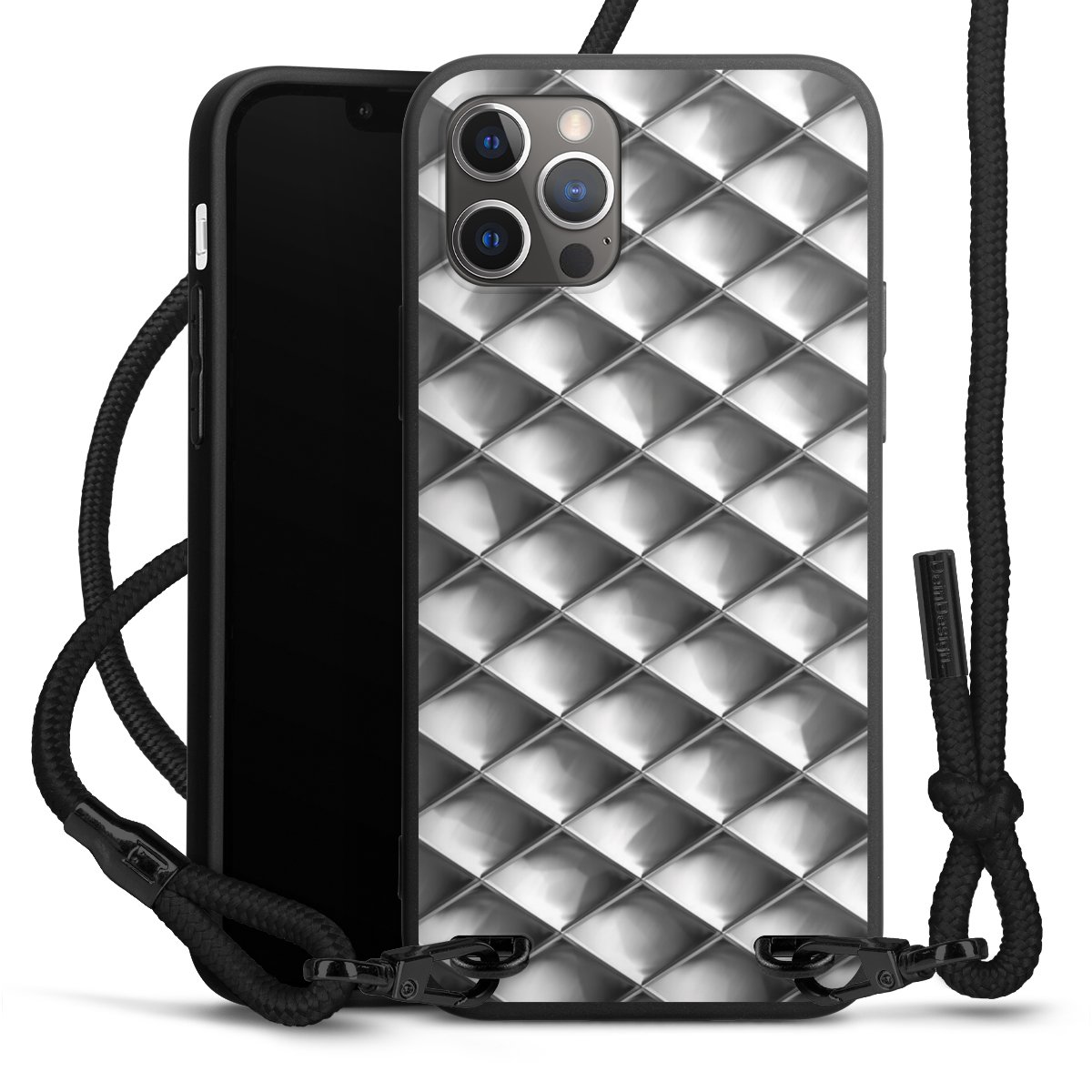 Pure Black: Phone case, fabric strap and metal details in stylish matt black.