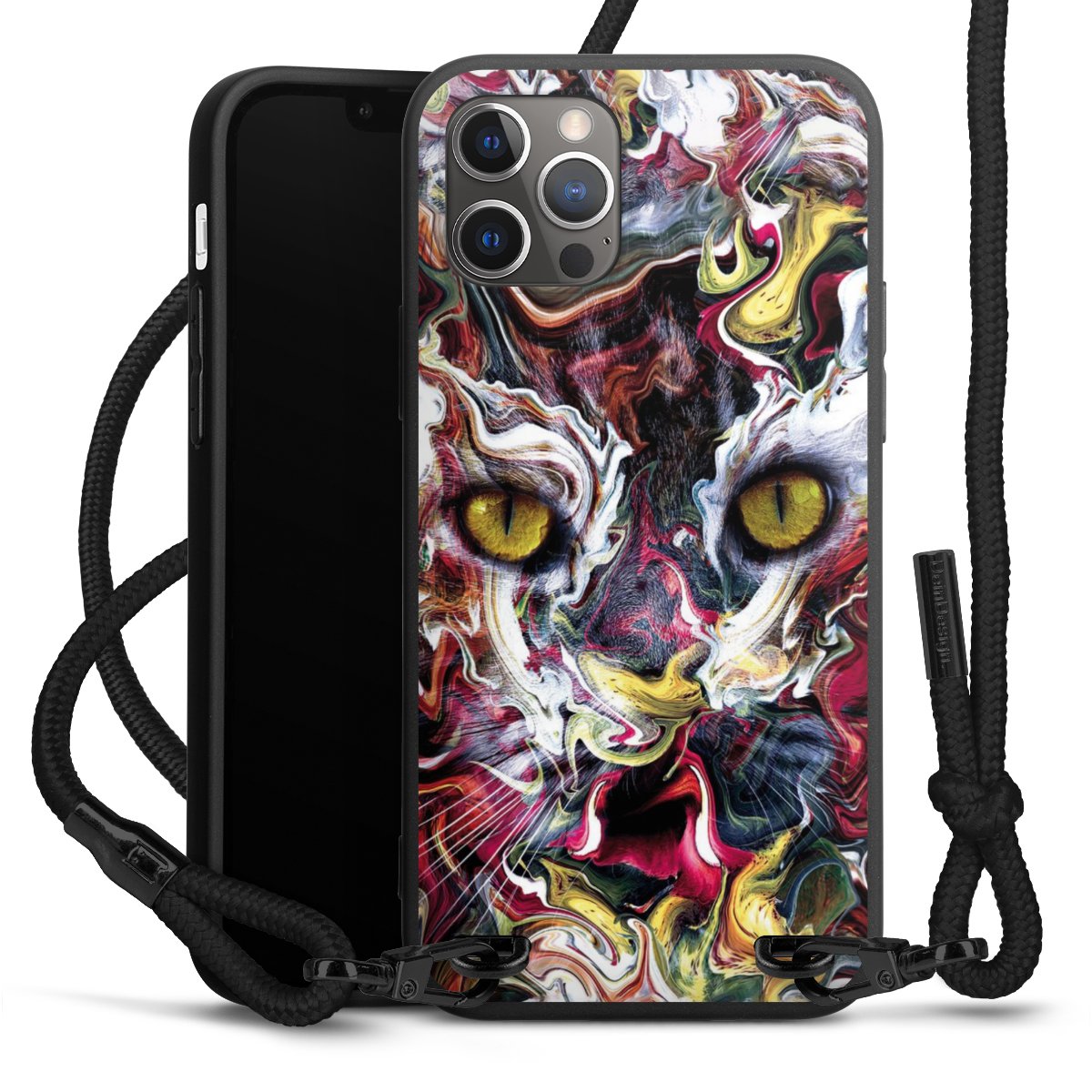 The matt black silicone case is made of flexible TPU (thermoplastic polyurethane) and offers robust protection. The durable, unbreakable material makes the cover flexible and dimensionally stable at the same time. The matte surface makes your design stand out more and is less susceptible to fingerprints and dirt. The stylish trend accessory fits comfortably in the hand and is perfectly complemented by the fabric (polyester) mobile phone strap. The braided fabric strap is approx. 1.70 metres long with a diameter of approx. 0.5 cm. Due to the special knotting technique, the length of the strap can be adjusted by simply pulling it, so that you can adapt it individually to your wishes. The practical case to wear around your neck is available with the fabric strap in black. As a little icing on the cake, we have provided the strap with a chic metal fastener in matt black. The strap is securely fastened to the case with loops made of high-quality genuine leather and press studs. The ends of the fabric strap are covered with metallic end caps and thus protected from fraying.