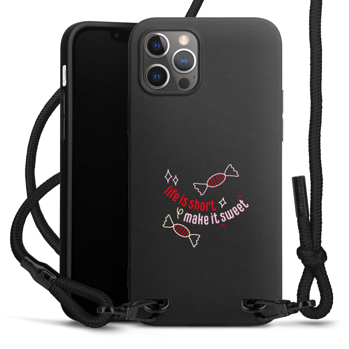 The matt black silicone case is made of flexible TPU (thermoplastic polyurethane) and offers robust protection. The durable, unbreakable material makes the cover flexible and dimensionally stable at the same time. The matte surface makes your design stand out more and is less susceptible to fingerprints and dirt. The stylish trend accessory fits comfortably in the hand and is perfectly complemented by the fabric (polyester) mobile phone strap. The braided fabric strap is approx. 1.70 metres long with a diameter of approx. 0.5 cm. Due to the special knotting technique, the length of the strap can be adjusted by simply pulling it, so that you can adapt it individually to your wishes. The practical case to wear around your neck is available with the fabric strap in black. As a little icing on the cake, we have provided the strap with a chic metal fastener in matt black. The strap is securely fastened to the case with loops made of high-quality genuine leather and press studs. The ends of the fabric strap are covered with metallic end caps and thus protected from fraying.
