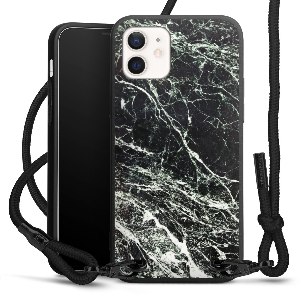 The matt black silicone case is made of flexible TPU (thermoplastic polyurethane) and offers robust protection. The durable, unbreakable material makes the cover flexible and dimensionally stable at the same time. The matte surface makes your design stand out more and is less susceptible to fingerprints and dirt. The stylish trend accessory fits comfortably in the hand and is perfectly complemented by the fabric (polyester) mobile phone strap. The braided fabric strap is approx. 1.70 metres long with a diameter of approx. 0.5 cm. Due to the special knotting technique, the length of the strap can be adjusted by simply pulling it, so that you can adapt it individually to your wishes. The practical case to wear around your neck is available with the fabric strap in black. As a little icing on the cake, we have provided the strap with a chic metal fastener in matt black. The strap is securely fastened to the case with loops made of high-quality genuine leather and press studs. The ends of the fabric strap are covered with metallic end caps and thus protected from fraying.
