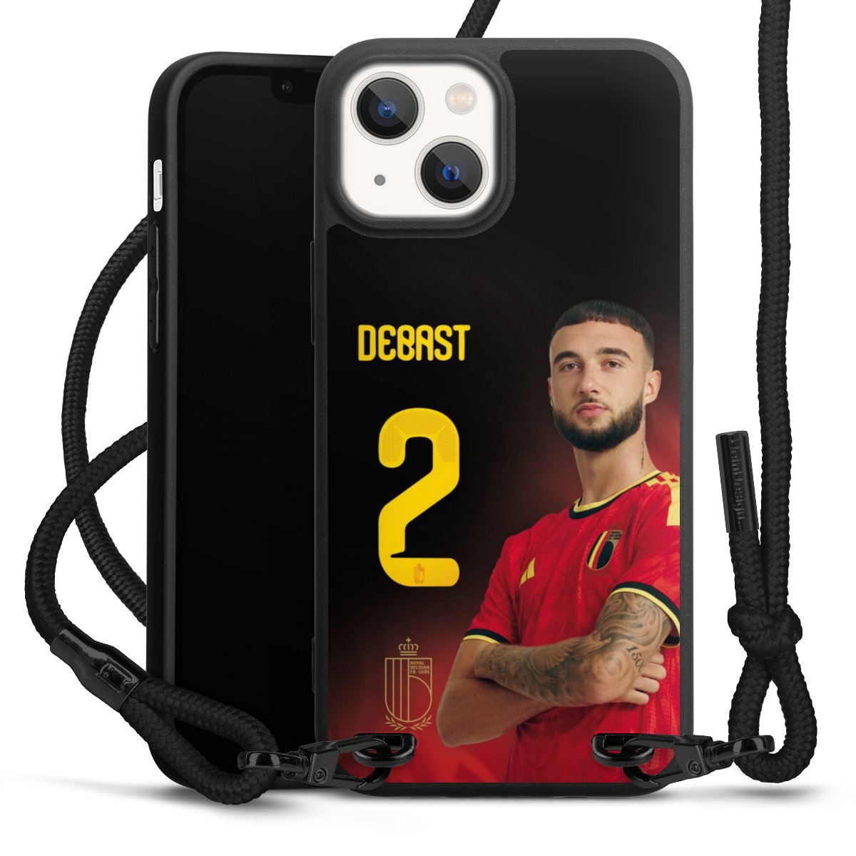 The matt black silicone case is made of flexible TPU (thermoplastic polyurethane) and offers robust protection. The durable, unbreakable material makes the cover flexible and dimensionally stable at the same time. The matte surface makes your design stand out more and is less susceptible to fingerprints and dirt. The stylish trend accessory fits comfortably in the hand and is perfectly complemented by the fabric (polyester) mobile phone strap. The braided fabric strap is approx. 1.70 metres long with a diameter of approx. 0.5 cm. Due to the special knotting technique, the length of the strap can be adjusted by simply pulling it, so that you can adapt it individually to your wishes. The practical case to wear around your neck is available with the fabric strap in black. As a little icing on the cake, we have provided the strap with a chic metal fastener in matt black. The strap is securely fastened to the case with loops made of high-quality genuine leather and press studs. The ends of the fabric strap are covered with metallic end caps and thus protected from fraying.