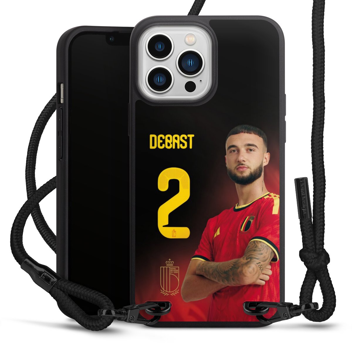 The matt black silicone case is made of flexible TPU (thermoplastic polyurethane) and offers robust protection. The durable, unbreakable material makes the cover flexible and dimensionally stable at the same time. The matte surface makes your design stand out more and is less susceptible to fingerprints and dirt. The stylish trend accessory fits comfortably in the hand and is perfectly complemented by the fabric (polyester) mobile phone strap. The braided fabric strap is approx. 1.70 metres long with a diameter of approx. 0.5 cm. Due to the special knotting technique, the length of the strap can be adjusted by simply pulling it, so that you can adapt it individually to your wishes. The practical case to wear around your neck is available with the fabric strap in black. As a little icing on the cake, we have provided the strap with a chic metal fastener in matt black. The strap is securely fastened to the case with loops made of high-quality genuine leather and press studs. The ends of the fabric strap are covered with metallic end caps and thus protected from fraying.
