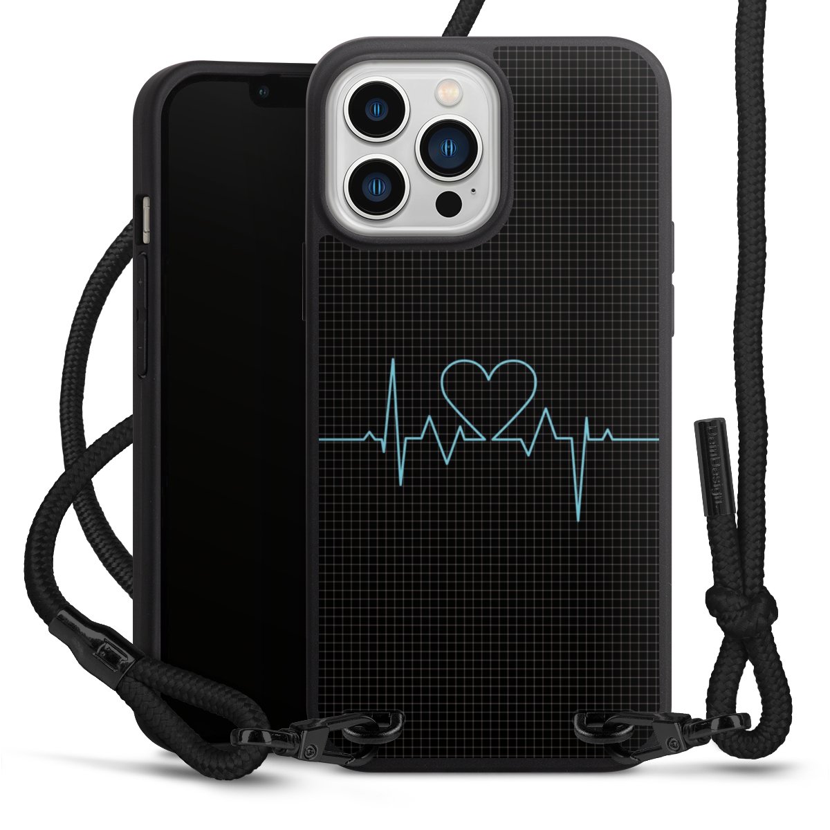The matt black silicone case is made of flexible TPU (thermoplastic polyurethane) and offers robust protection. The durable, unbreakable material makes the cover flexible and dimensionally stable at the same time. The matte surface makes your design stand out more and is less susceptible to fingerprints and dirt. The stylish trend accessory fits comfortably in the hand and is perfectly complemented by the fabric (polyester) mobile phone strap. The braided fabric strap is approx. 1.70 metres long with a diameter of approx. 0.5 cm. Due to the special knotting technique, the length of the strap can be adjusted by simply pulling it, so that you can adapt it individually to your wishes. The practical case to wear around your neck is available with the fabric strap in black. As a little icing on the cake, we have provided the strap with a chic metal fastener in matt black. The strap is securely fastened to the case with loops made of high-quality genuine leather and press studs. The ends of the fabric strap are covered with metallic end caps and thus protected from fraying.
