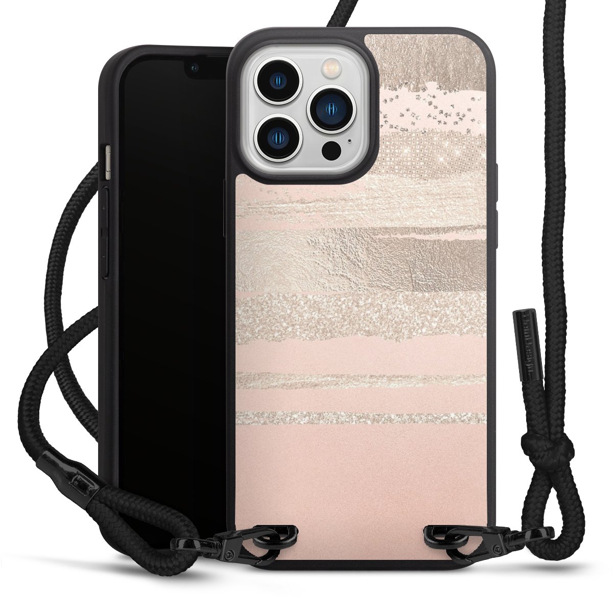 Pure Black: Phone case, fabric strap and metal details in stylish matt black.