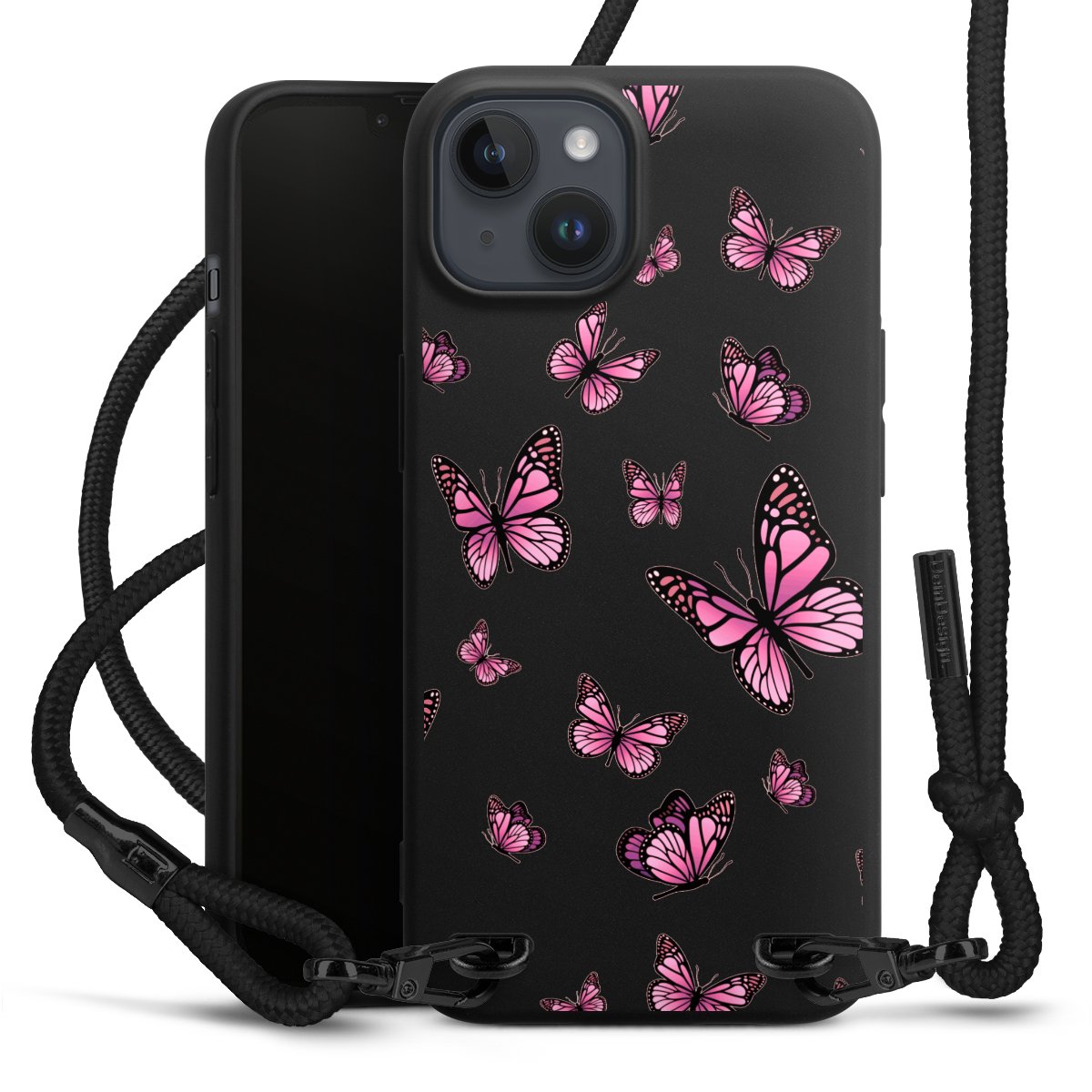 Pure Black: Phone case, fabric strap and metal details in stylish matt black.