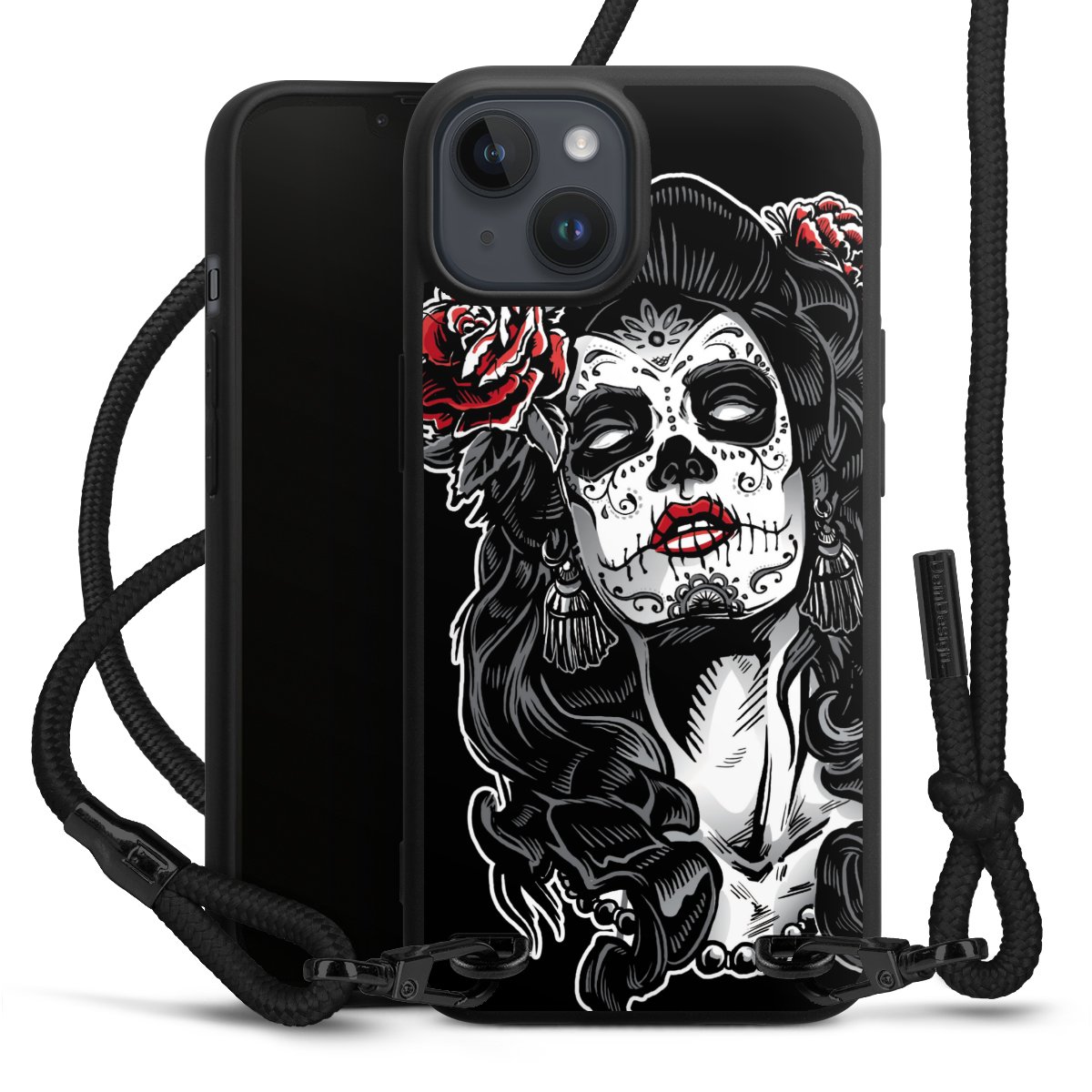 The matt black silicone case is made of flexible TPU (thermoplastic polyurethane) and offers robust protection. The durable, unbreakable material makes the cover flexible and dimensionally stable at the same time. The matte surface makes your design stand out more and is less susceptible to fingerprints and dirt. The stylish trend accessory fits comfortably in the hand and is perfectly complemented by the fabric (polyester) mobile phone strap. The braided fabric strap is approx. 1.70 metres long with a diameter of approx. 0.5 cm. Due to the special knotting technique, the length of the strap can be adjusted by simply pulling it, so that you can adapt it individually to your wishes. The practical case to wear around your neck is available with the fabric strap in black. As a little icing on the cake, we have provided the strap with a chic metal fastener in matt black. The strap is securely fastened to the case with loops made of high-quality genuine leather and press studs. The ends of the fabric strap are covered with metallic end caps and thus protected from fraying.