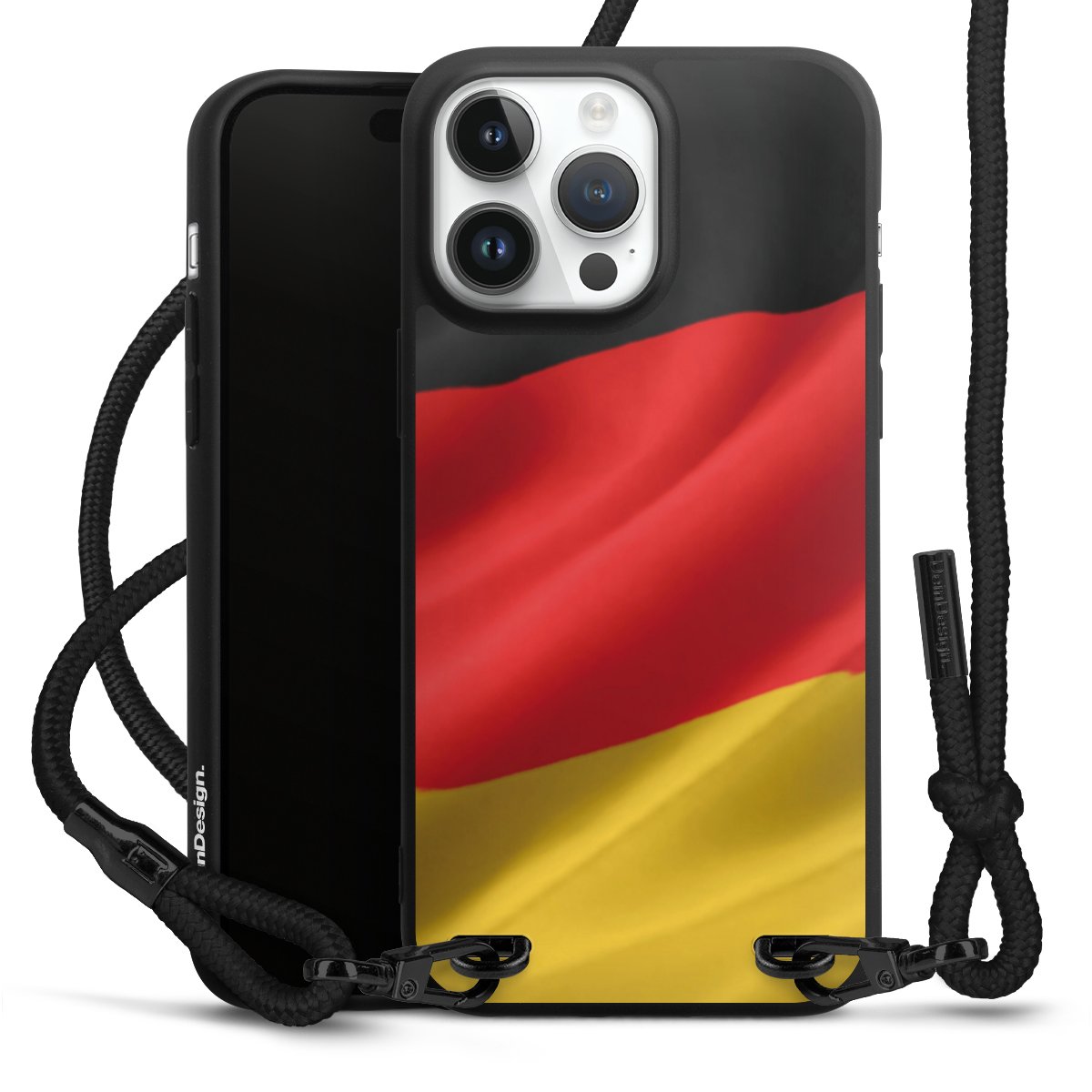 The matt black silicone case is made of flexible TPU (thermoplastic polyurethane) and offers robust protection. The durable, unbreakable material makes the cover flexible and dimensionally stable at the same time. The matte surface makes your design stand out more and is less susceptible to fingerprints and dirt. The stylish trend accessory fits comfortably in the hand and is perfectly complemented by the fabric (polyester) mobile phone strap. The braided fabric strap is approx. 1.70 metres long with a diameter of approx. 0.5 cm. Due to the special knotting technique, the length of the strap can be adjusted by simply pulling it, so that you can adapt it individually to your wishes. The practical case to wear around your neck is available with the fabric strap in black. As a little icing on the cake, we have provided the strap with a chic metal fastener in matt black. The strap is securely fastened to the case with loops made of high-quality genuine leather and press studs. The ends of the fabric strap are covered with metallic end caps and thus protected from fraying.