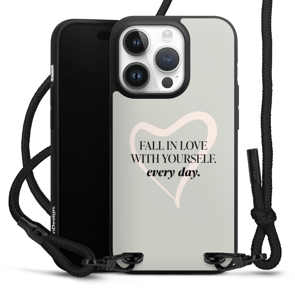 Pure Black: Phone case, fabric strap and metal details in stylish matt black.