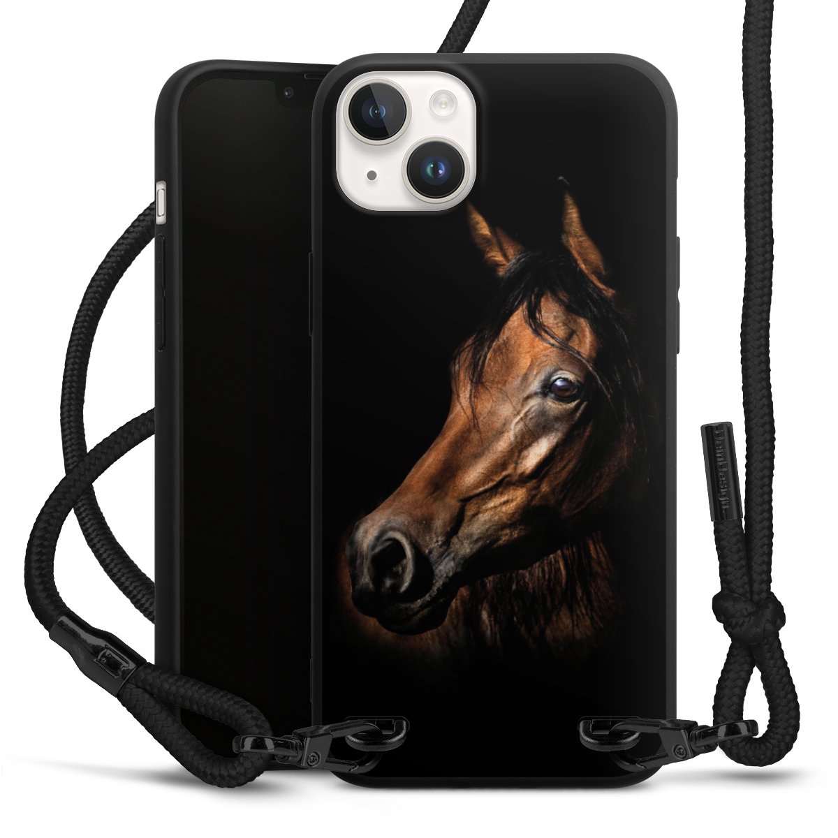 The matt black silicone case is made of flexible TPU (thermoplastic polyurethane) and offers robust protection. The durable, unbreakable material makes the cover flexible and dimensionally stable at the same time. The matte surface makes your design stand out more and is less susceptible to fingerprints and dirt. The stylish trend accessory fits comfortably in the hand and is perfectly complemented by the fabric (polyester) mobile phone strap. The braided fabric strap is approx. 1.70 metres long with a diameter of approx. 0.5 cm. Due to the special knotting technique, the length of the strap can be adjusted by simply pulling it, so that you can adapt it individually to your wishes. The practical case to wear around your neck is available with the fabric strap in black. As a little icing on the cake, we have provided the strap with a chic metal fastener in matt black. The strap is securely fastened to the case with loops made of high-quality genuine leather and press studs. The ends of the fabric strap are covered with metallic end caps and thus protected from fraying.