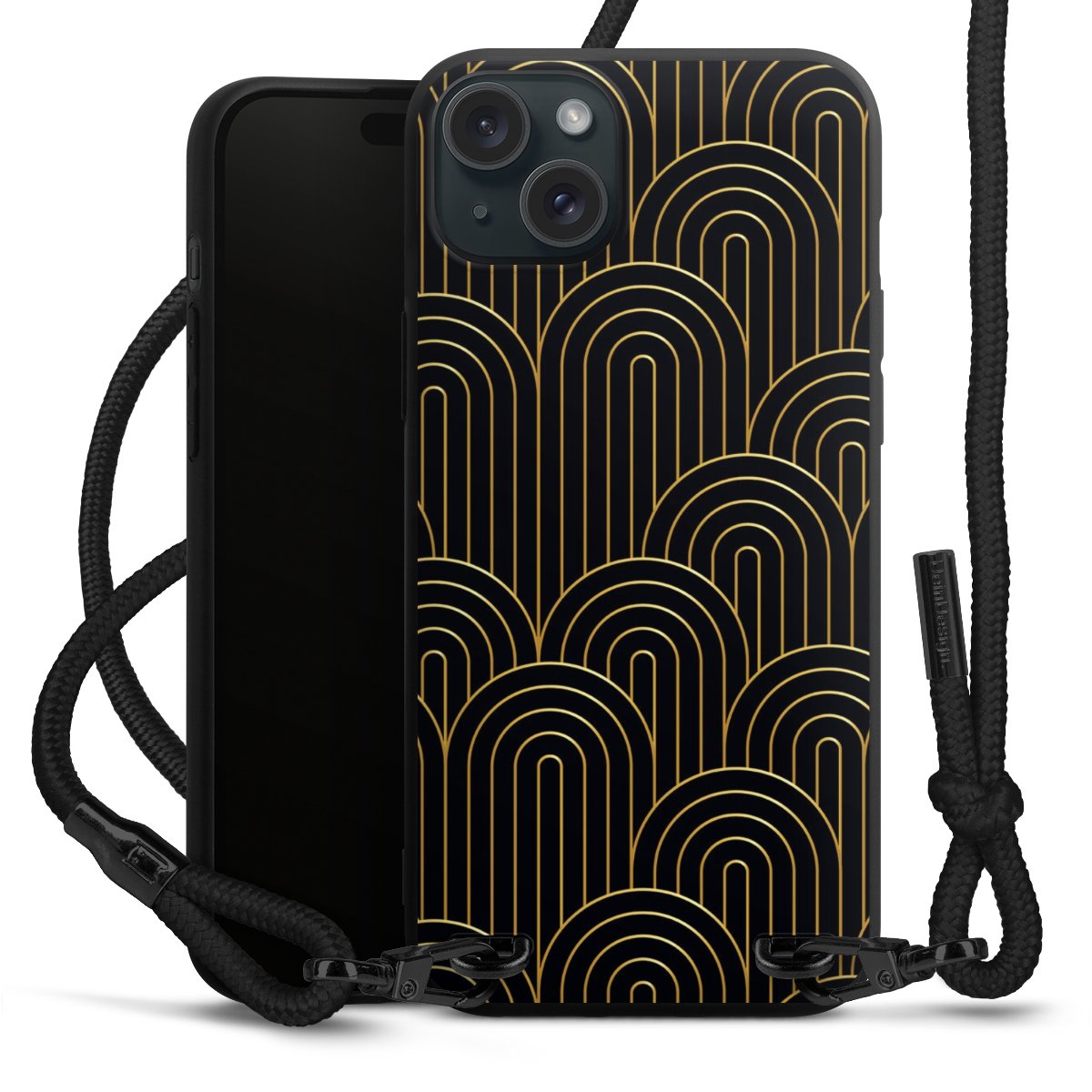 The matt black silicone case is made of flexible TPU (thermoplastic polyurethane) and offers robust protection. The durable, unbreakable material makes the cover flexible and dimensionally stable at the same time. The matte surface makes your design stand out more and is less susceptible to fingerprints and dirt. The stylish trend accessory fits comfortably in the hand and is perfectly complemented by the fabric (polyester) mobile phone strap. The braided fabric strap is approx. 1.70 metres long with a diameter of approx. 0.5 cm. Due to the special knotting technique, the length of the strap can be adjusted by simply pulling it, so that you can adapt it individually to your wishes. The practical case to wear around your neck is available with the fabric strap in black. As a little icing on the cake, we have provided the strap with a chic metal fastener in matt black. The strap is securely fastened to the case with loops made of high-quality genuine leather and press studs. The ends of the fabric strap are covered with metallic end caps and thus protected from fraying.
