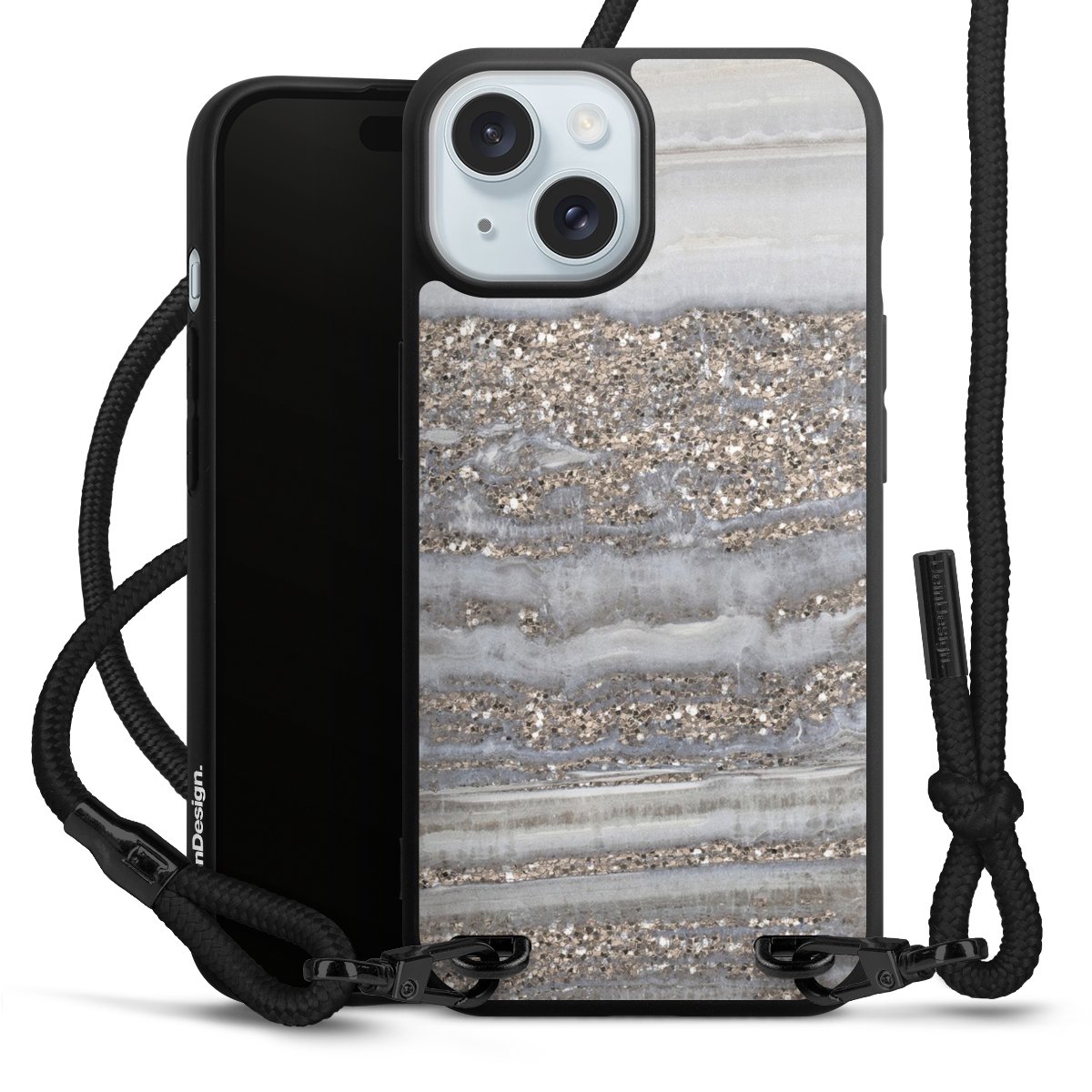 Pure Black: Phone case, fabric strap and metal details in stylish matt black.