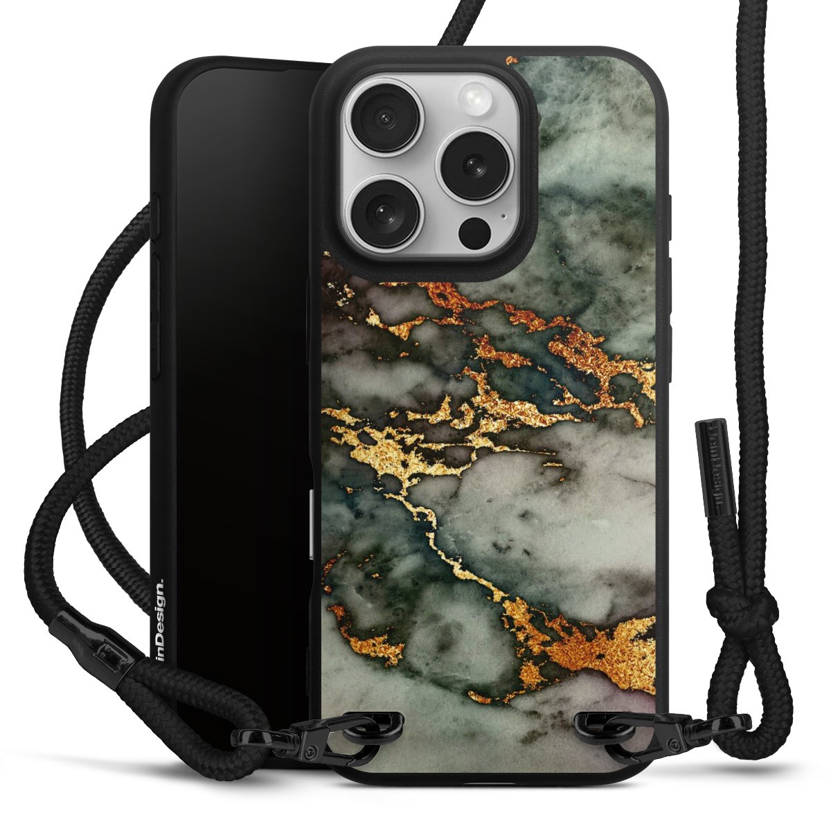 Pure Black: Phone case, fabric strap and metal details in stylish matt black.