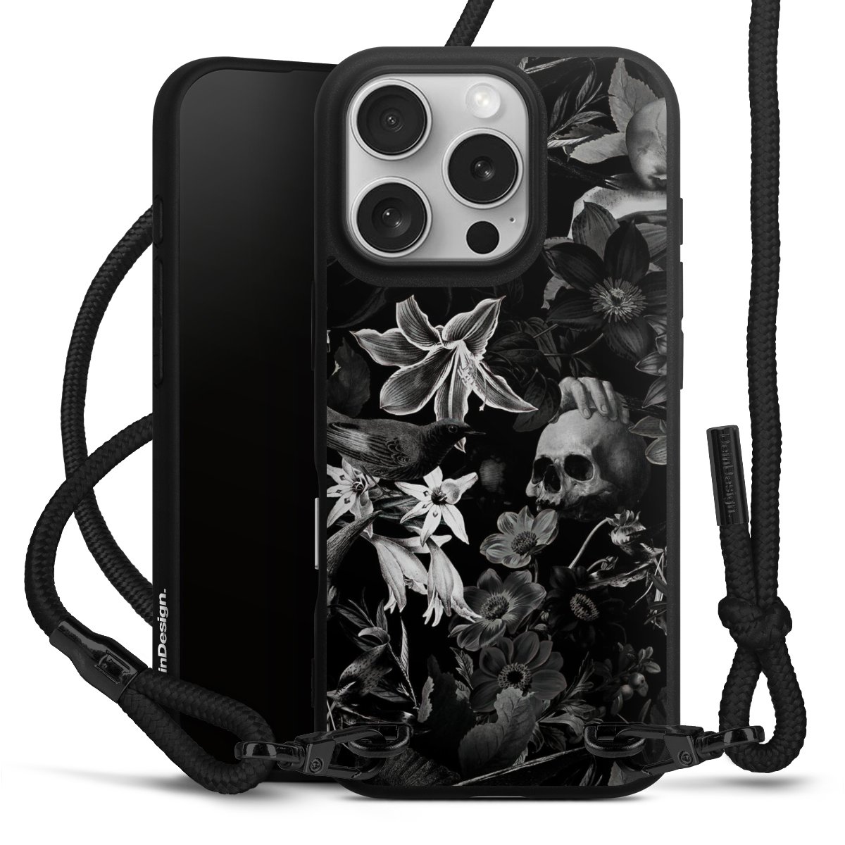 Pure Black: Phone case, fabric strap and metal details in stylish matt black.