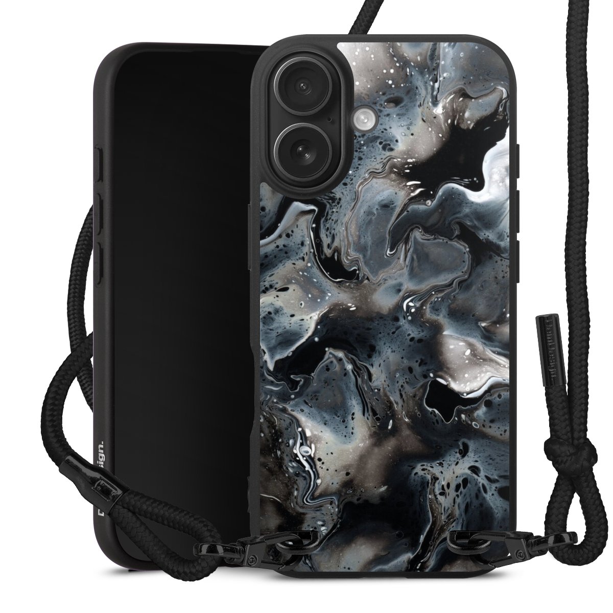 Pure Black: Phone case, fabric strap and metal details in stylish matt black.