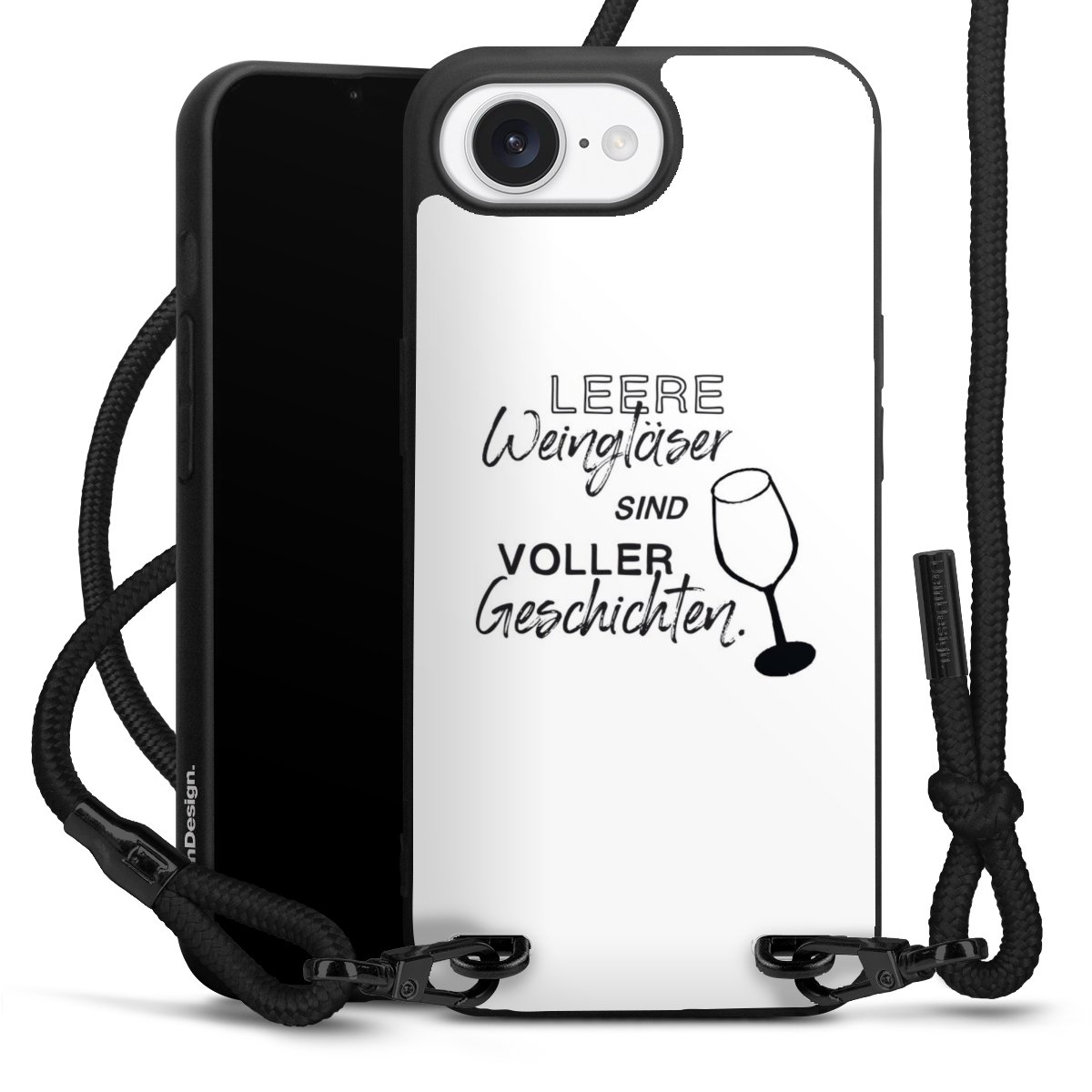 The matt black silicone case is made of flexible TPU (thermoplastic polyurethane) and offers robust protection. The durable, unbreakable material makes the cover flexible and dimensionally stable at the same time. The matte surface makes your design stand out more and is less susceptible to fingerprints and dirt. The stylish trend accessory fits comfortably in the hand and is perfectly complemented by the fabric (polyester) mobile phone strap. The braided fabric strap is approx. 1.70 metres long with a diameter of approx. 0.5 cm. Due to the special knotting technique, the length of the strap can be adjusted by simply pulling it, so that you can adapt it individually to your wishes. The practical case to wear around your neck is available with the fabric strap in black. As a little icing on the cake, we have provided the strap with a chic metal fastener in matt black. The strap is securely fastened to the case with loops made of high-quality genuine leather and press studs. The ends of the fabric strap are covered with metallic end caps and thus protected from fraying.
