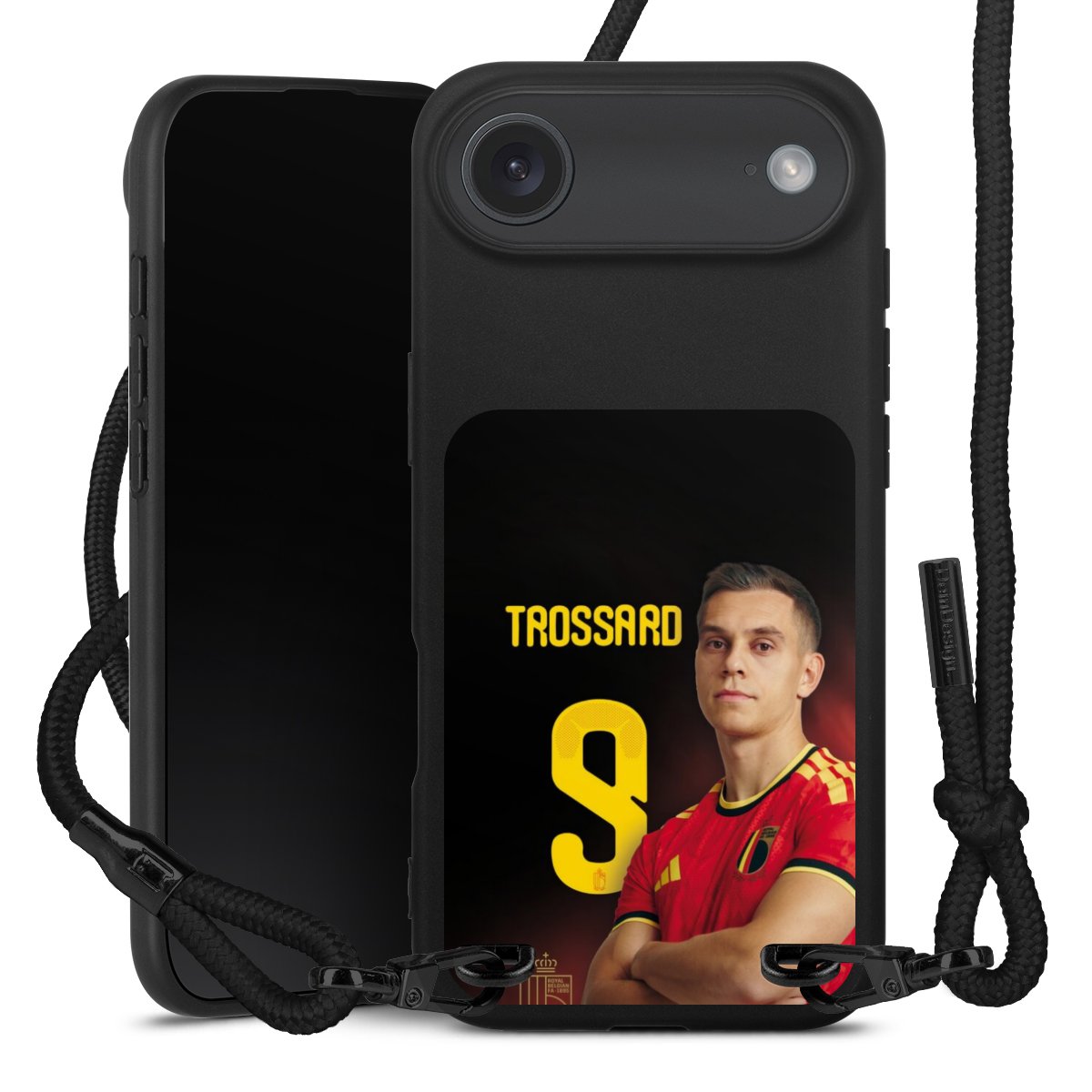 The matt black silicone case is made of flexible TPU (thermoplastic polyurethane) and offers robust protection. The durable, unbreakable material makes the cover flexible and dimensionally stable at the same time. The matte surface makes your design stand out more and is less susceptible to fingerprints and dirt. The stylish trend accessory fits comfortably in the hand and is perfectly complemented by the fabric (polyester) mobile phone strap. The braided fabric strap is approx. 1.70 metres long with a diameter of approx. 0.5 cm. Due to the special knotting technique, the length of the strap can be adjusted by simply pulling it, so that you can adapt it individually to your wishes. The practical case to wear around your neck is available with the fabric strap in black. As a little icing on the cake, we have provided the strap with a chic metal fastener in matt black. The strap is securely fastened to the case with loops made of high-quality genuine leather and press studs. The ends of the fabric strap are covered with metallic end caps and thus protected from fraying.