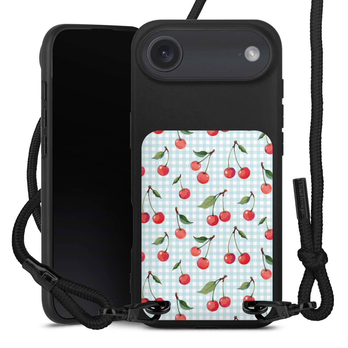 Pure Black: Phone case, fabric strap and metal details in stylish matt black.