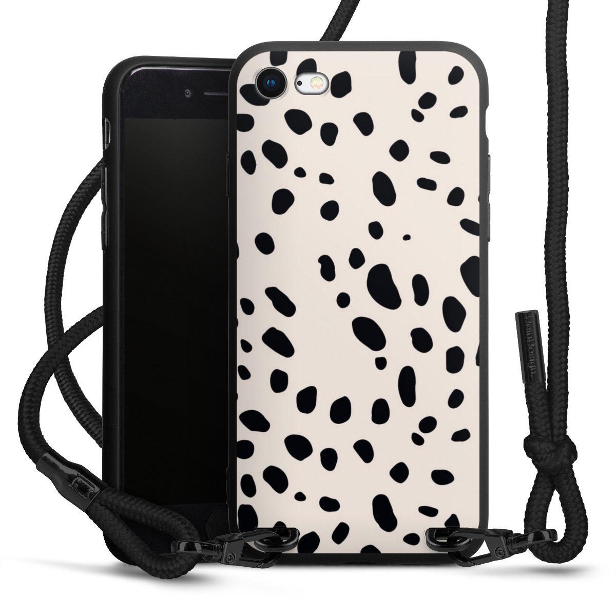 The matt black silicone case is made of flexible TPU (thermoplastic polyurethane) and offers robust protection. The durable, unbreakable material makes the cover flexible and dimensionally stable at the same time. The matte surface makes your design stand out more and is less susceptible to fingerprints and dirt. The stylish trend accessory fits comfortably in the hand and is perfectly complemented by the fabric (polyester) mobile phone strap. The braided fabric strap is approx. 1.70 metres long with a diameter of approx. 0.5 cm. Due to the special knotting technique, the length of the strap can be adjusted by simply pulling it, so that you can adapt it individually to your wishes. The practical case to wear around your neck is available with the fabric strap in black. As a little icing on the cake, we have provided the strap with a chic metal fastener in matt black. The strap is securely fastened to the case with loops made of high-quality genuine leather and press studs. The ends of the fabric strap are covered with metallic end caps and thus protected from fraying.