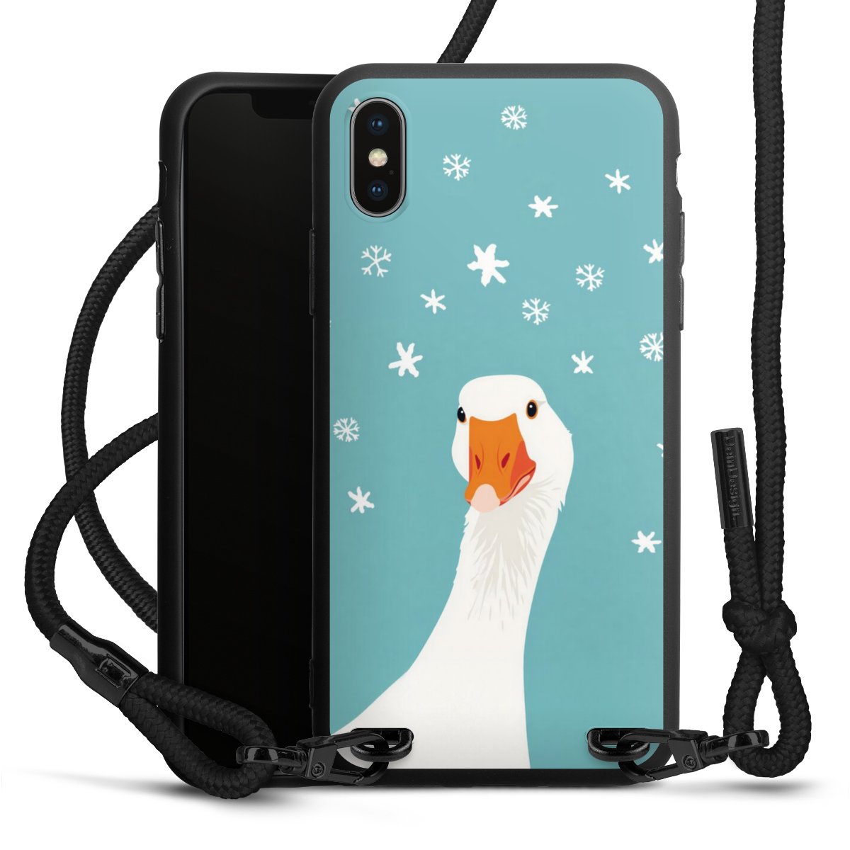 The matt black silicone case is made of flexible TPU (thermoplastic polyurethane) and offers robust protection. The durable, unbreakable material makes the cover flexible and dimensionally stable at the same time. The matte surface makes your design stand out more and is less susceptible to fingerprints and dirt. The stylish trend accessory fits comfortably in the hand and is perfectly complemented by the fabric (polyester) mobile phone strap. The braided fabric strap is approx. 1.70 metres long with a diameter of approx. 0.5 cm. Due to the special knotting technique, the length of the strap can be adjusted by simply pulling it, so that you can adapt it individually to your wishes. The practical case to wear around your neck is available with the fabric strap in black. As a little icing on the cake, we have provided the strap with a chic metal fastener in matt black. The strap is securely fastened to the case with loops made of high-quality genuine leather and press studs. The ends of the fabric strap are covered with metallic end caps and thus protected from fraying.