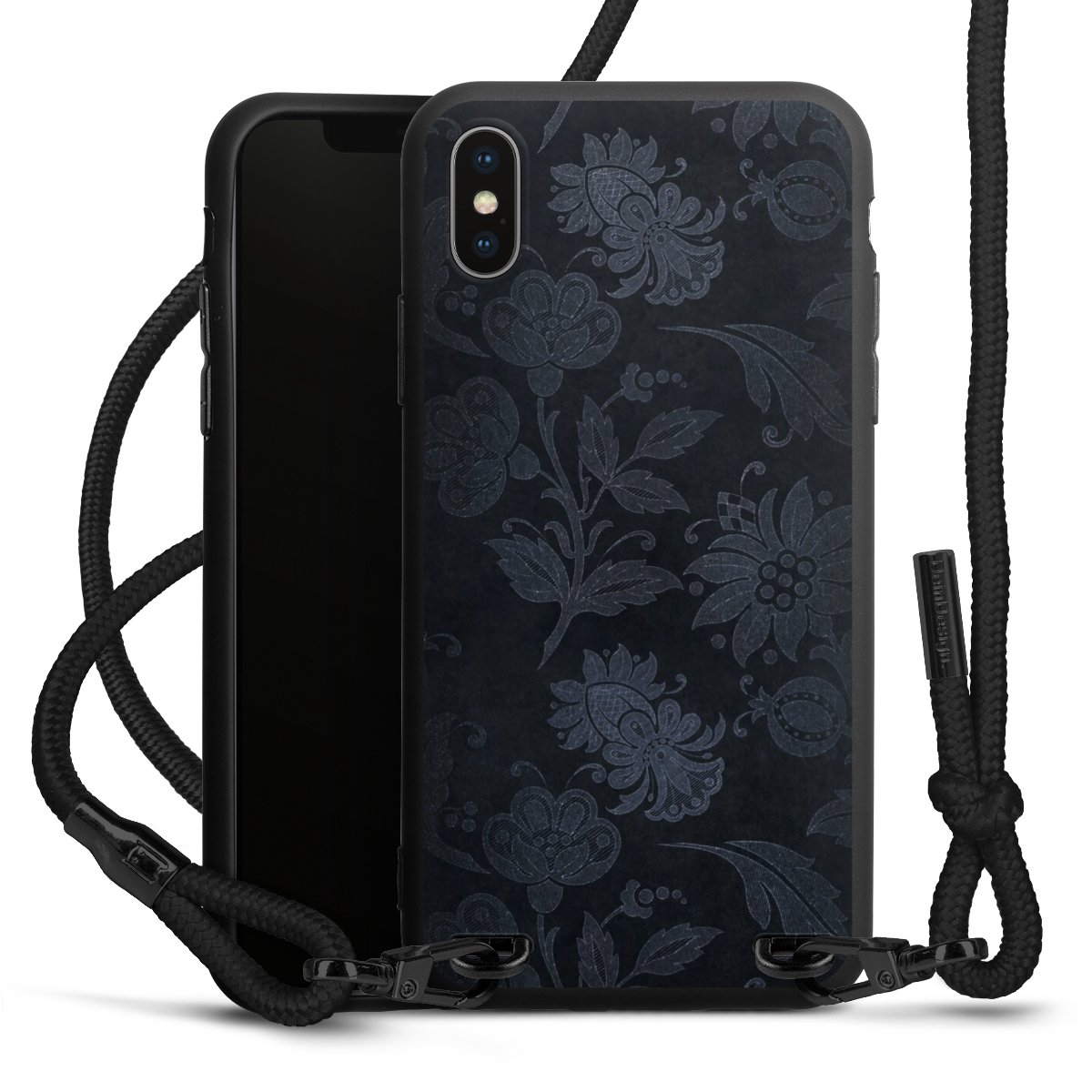 The matt black silicone case is made of flexible TPU (thermoplastic polyurethane) and offers robust protection. The durable, unbreakable material makes the cover flexible and dimensionally stable at the same time. The matte surface makes your design stand out more and is less susceptible to fingerprints and dirt. The stylish trend accessory fits comfortably in the hand and is perfectly complemented by the fabric (polyester) mobile phone strap. The braided fabric strap is approx. 1.70 metres long with a diameter of approx. 0.5 cm. Due to the special knotting technique, the length of the strap can be adjusted by simply pulling it, so that you can adapt it individually to your wishes. The practical case to wear around your neck is available with the fabric strap in black. As a little icing on the cake, we have provided the strap with a chic metal fastener in matt black. The strap is securely fastened to the case with loops made of high-quality genuine leather and press studs. The ends of the fabric strap are covered with metallic end caps and thus protected from fraying.