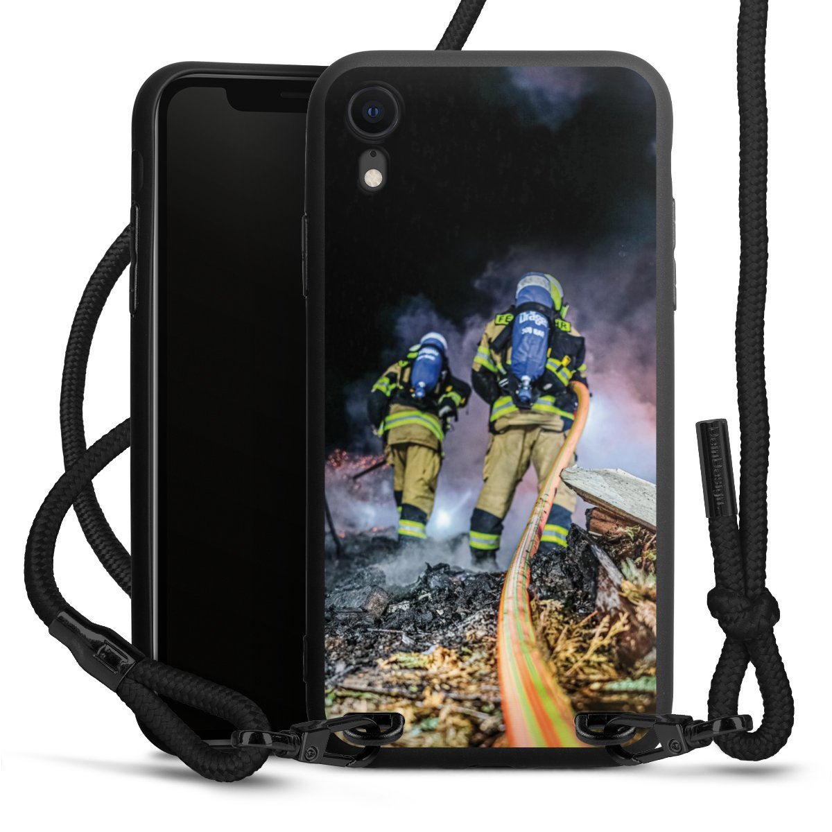 The matt black silicone case is made of flexible TPU (thermoplastic polyurethane) and offers robust protection. The durable, unbreakable material makes the cover flexible and dimensionally stable at the same time. The matte surface makes your design stand out more and is less susceptible to fingerprints and dirt. The stylish trend accessory fits comfortably in the hand and is perfectly complemented by the fabric (polyester) mobile phone strap. The braided fabric strap is approx. 1.70 metres long with a diameter of approx. 0.5 cm. Due to the special knotting technique, the length of the strap can be adjusted by simply pulling it, so that you can adapt it individually to your wishes. The practical case to wear around your neck is available with the fabric strap in black. As a little icing on the cake, we have provided the strap with a chic metal fastener in matt black. The strap is securely fastened to the case with loops made of high-quality genuine leather and press studs. The ends of the fabric strap are covered with metallic end caps and thus protected from fraying.