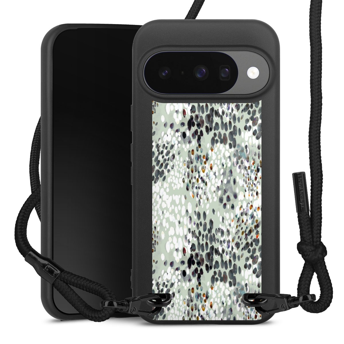 The matt black silicone case is made of flexible TPU (thermoplastic polyurethane) and offers robust protection. The durable, unbreakable material makes the cover flexible and dimensionally stable at the same time. The matte surface makes your design stand out more and is less susceptible to fingerprints and dirt. The stylish trend accessory fits comfortably in the hand and is perfectly complemented by the fabric (polyester) mobile phone strap. The braided fabric strap is approx. 1.70 metres long with a diameter of approx. 0.5 cm. Due to the special knotting technique, the length of the strap can be adjusted by simply pulling it, so that you can adapt it individually to your wishes. The practical case to wear around your neck is available with the fabric strap in black. As a little icing on the cake, we have provided the strap with a chic metal fastener in matt black. The strap is securely fastened to the case with loops made of high-quality genuine leather and press studs. The ends of the fabric strap are covered with metallic end caps and thus protected from fraying.
