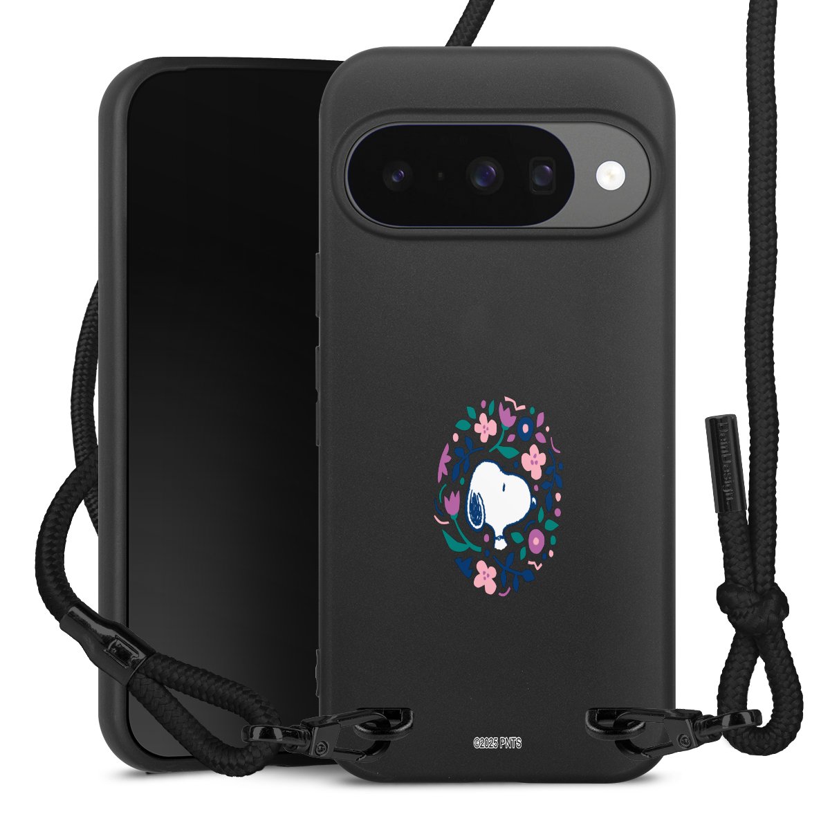 The matt black silicone case is made of flexible TPU (thermoplastic polyurethane) and offers robust protection. The durable, unbreakable material makes the cover flexible and dimensionally stable at the same time. The matte surface makes your design stand out more and is less susceptible to fingerprints and dirt. The stylish trend accessory fits comfortably in the hand and is perfectly complemented by the fabric (polyester) mobile phone strap. The braided fabric strap is approx. 1.70 metres long with a diameter of approx. 0.5 cm. Due to the special knotting technique, the length of the strap can be adjusted by simply pulling it, so that you can adapt it individually to your wishes. The practical case to wear around your neck is available with the fabric strap in black. As a little icing on the cake, we have provided the strap with a chic metal fastener in matt black. The strap is securely fastened to the case with loops made of high-quality genuine leather and press studs. The ends of the fabric strap are covered with metallic end caps and thus protected from fraying.