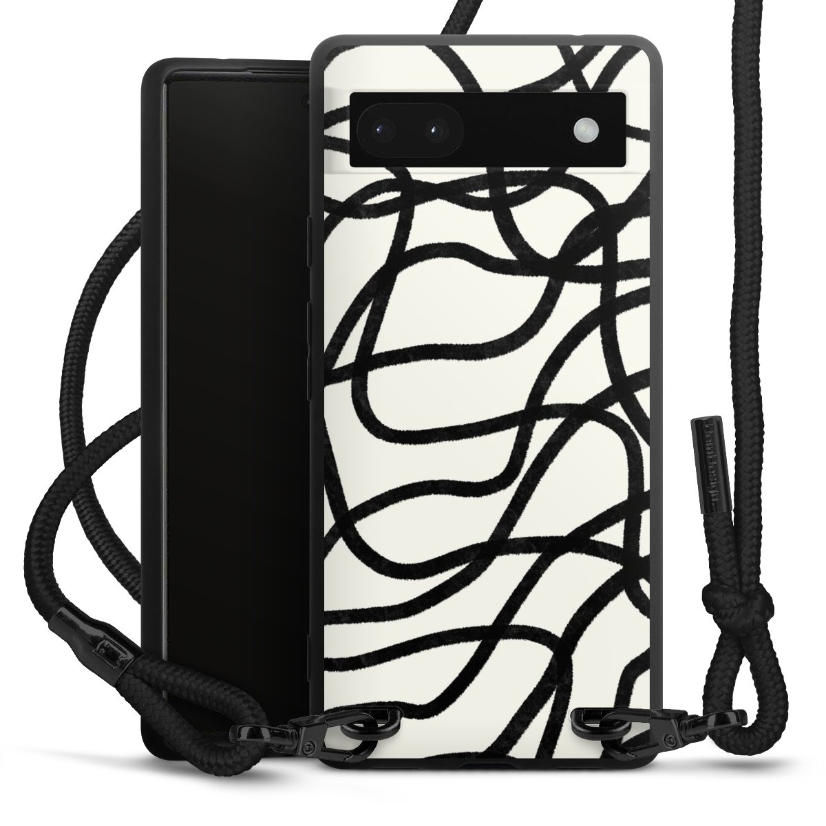 The matt black silicone case is made of flexible TPU (thermoplastic polyurethane) and offers robust protection. The durable, unbreakable material makes the cover flexible and dimensionally stable at the same time. The matte surface makes your design stand out more and is less susceptible to fingerprints and dirt. The stylish trend accessory fits comfortably in the hand and is perfectly complemented by the fabric (polyester) mobile phone strap. The braided fabric strap is approx. 1.70 metres long with a diameter of approx. 0.5 cm. Due to the special knotting technique, the length of the strap can be adjusted by simply pulling it, so that you can adapt it individually to your wishes. The practical case to wear around your neck is available with the fabric strap in black. As a little icing on the cake, we have provided the strap with a chic metal fastener in matt black. The strap is securely fastened to the case with loops made of high-quality genuine leather and press studs. The ends of the fabric strap are covered with metallic end caps and thus protected from fraying.