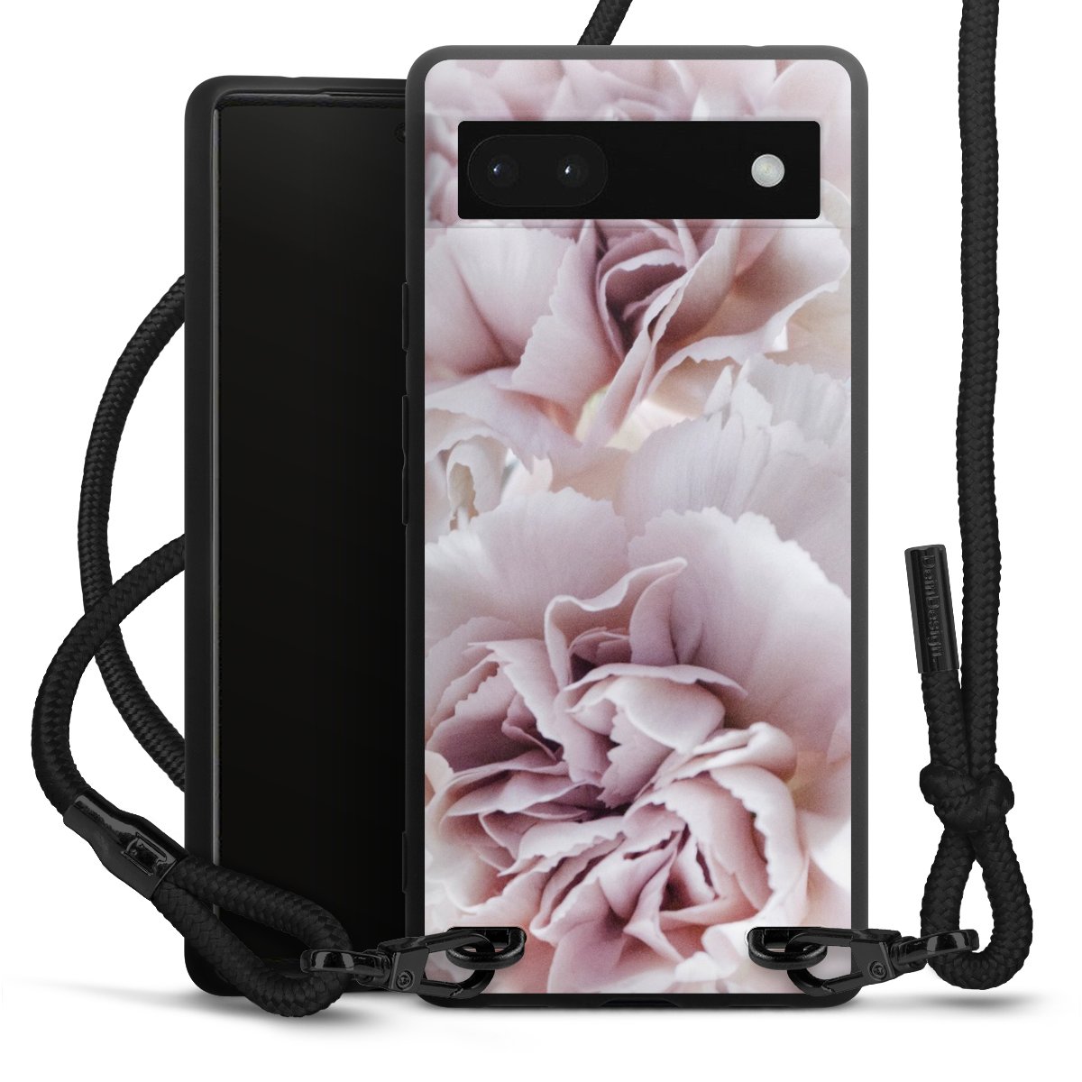 The matt black silicone case is made of flexible TPU (thermoplastic polyurethane) and offers robust protection. The durable, unbreakable material makes the cover flexible and dimensionally stable at the same time. The matte surface makes your design stand out more and is less susceptible to fingerprints and dirt. The stylish trend accessory fits comfortably in the hand and is perfectly complemented by the fabric (polyester) mobile phone strap. The braided fabric strap is approx. 1.70 metres long with a diameter of approx. 0.5 cm. Due to the special knotting technique, the length of the strap can be adjusted by simply pulling it, so that you can adapt it individually to your wishes. The practical case to wear around your neck is available with the fabric strap in black. As a little icing on the cake, we have provided the strap with a chic metal fastener in matt black. The strap is securely fastened to the case with loops made of high-quality genuine leather and press studs. The ends of the fabric strap are covered with metallic end caps and thus protected from fraying.