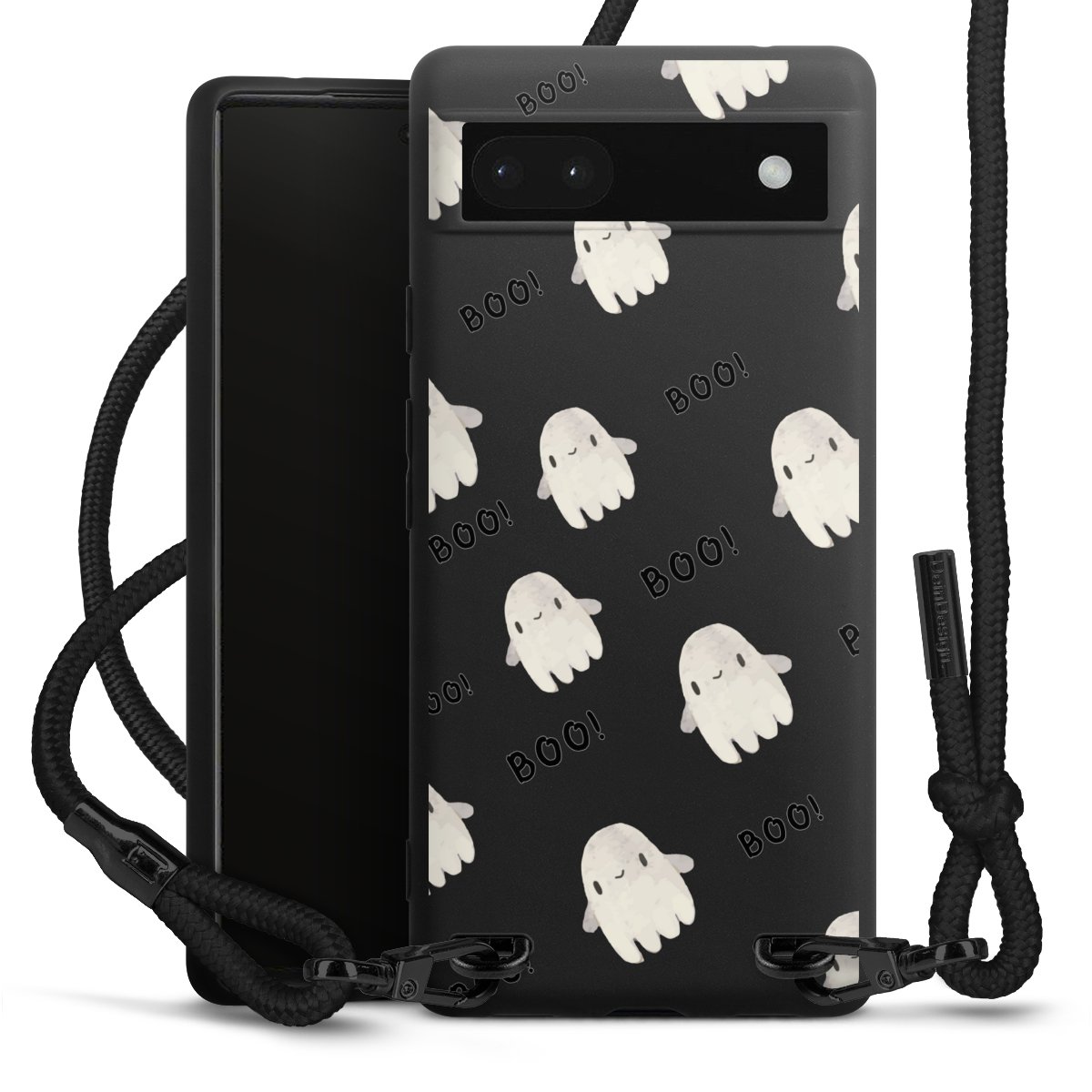 The matt black silicone case is made of flexible TPU (thermoplastic polyurethane) and offers robust protection. The durable, unbreakable material makes the cover flexible and dimensionally stable at the same time. The matte surface makes your design stand out more and is less susceptible to fingerprints and dirt. The stylish trend accessory fits comfortably in the hand and is perfectly complemented by the fabric (polyester) mobile phone strap. The braided fabric strap is approx. 1.70 metres long with a diameter of approx. 0.5 cm. Due to the special knotting technique, the length of the strap can be adjusted by simply pulling it, so that you can adapt it individually to your wishes. The practical case to wear around your neck is available with the fabric strap in black. As a little icing on the cake, we have provided the strap with a chic metal fastener in matt black. The strap is securely fastened to the case with loops made of high-quality genuine leather and press studs. The ends of the fabric strap are covered with metallic end caps and thus protected from fraying.
