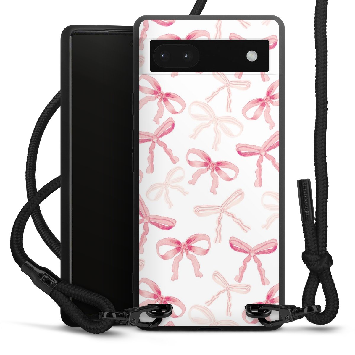 The matt black silicone case is made of flexible TPU (thermoplastic polyurethane) and offers robust protection. The durable, unbreakable material makes the cover flexible and dimensionally stable at the same time. The matte surface makes your design stand out more and is less susceptible to fingerprints and dirt. The stylish trend accessory fits comfortably in the hand and is perfectly complemented by the fabric (polyester) mobile phone strap. The braided fabric strap is approx. 1.70 metres long with a diameter of approx. 0.5 cm. Due to the special knotting technique, the length of the strap can be adjusted by simply pulling it, so that you can adapt it individually to your wishes. The practical case to wear around your neck is available with the fabric strap in black. As a little icing on the cake, we have provided the strap with a chic metal fastener in matt black. The strap is securely fastened to the case with loops made of high-quality genuine leather and press studs. The ends of the fabric strap are covered with metallic end caps and thus protected from fraying.