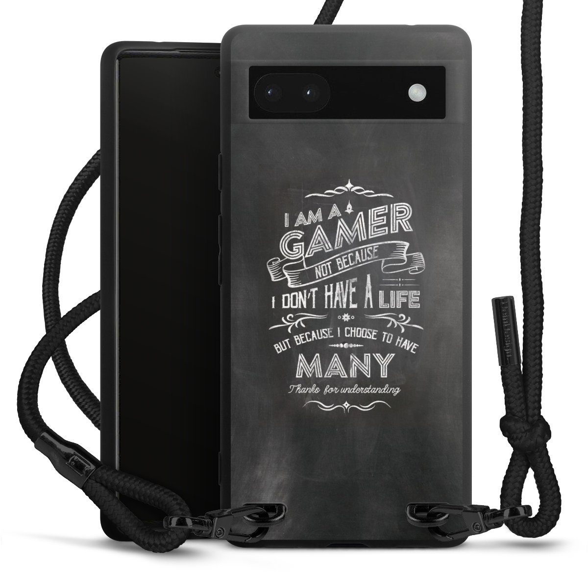 The matt black silicone case is made of flexible TPU (thermoplastic polyurethane) and offers robust protection. The durable, unbreakable material makes the cover flexible and dimensionally stable at the same time. The matte surface makes your design stand out more and is less susceptible to fingerprints and dirt. The stylish trend accessory fits comfortably in the hand and is perfectly complemented by the fabric (polyester) mobile phone strap. The braided fabric strap is approx. 1.70 metres long with a diameter of approx. 0.5 cm. Due to the special knotting technique, the length of the strap can be adjusted by simply pulling it, so that you can adapt it individually to your wishes. The practical case to wear around your neck is available with the fabric strap in black. As a little icing on the cake, we have provided the strap with a chic metal fastener in matt black. The strap is securely fastened to the case with loops made of high-quality genuine leather and press studs. The ends of the fabric strap are covered with metallic end caps and thus protected from fraying.