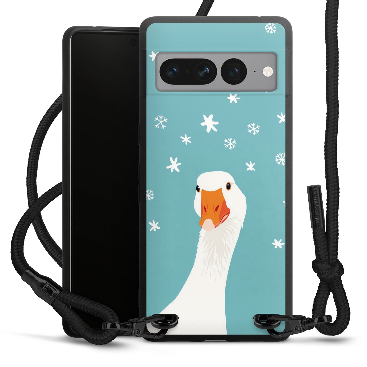 The matt black silicone case is made of flexible TPU (thermoplastic polyurethane) and offers robust protection. The durable, unbreakable material makes the cover flexible and dimensionally stable at the same time. The matte surface makes your design stand out more and is less susceptible to fingerprints and dirt. The stylish trend accessory fits comfortably in the hand and is perfectly complemented by the fabric (polyester) mobile phone strap. The braided fabric strap is approx. 1.70 metres long with a diameter of approx. 0.5 cm. Due to the special knotting technique, the length of the strap can be adjusted by simply pulling it, so that you can adapt it individually to your wishes. The practical case to wear around your neck is available with the fabric strap in black. As a little icing on the cake, we have provided the strap with a chic metal fastener in matt black. The strap is securely fastened to the case with loops made of high-quality genuine leather and press studs. The ends of the fabric strap are covered with metallic end caps and thus protected from fraying.