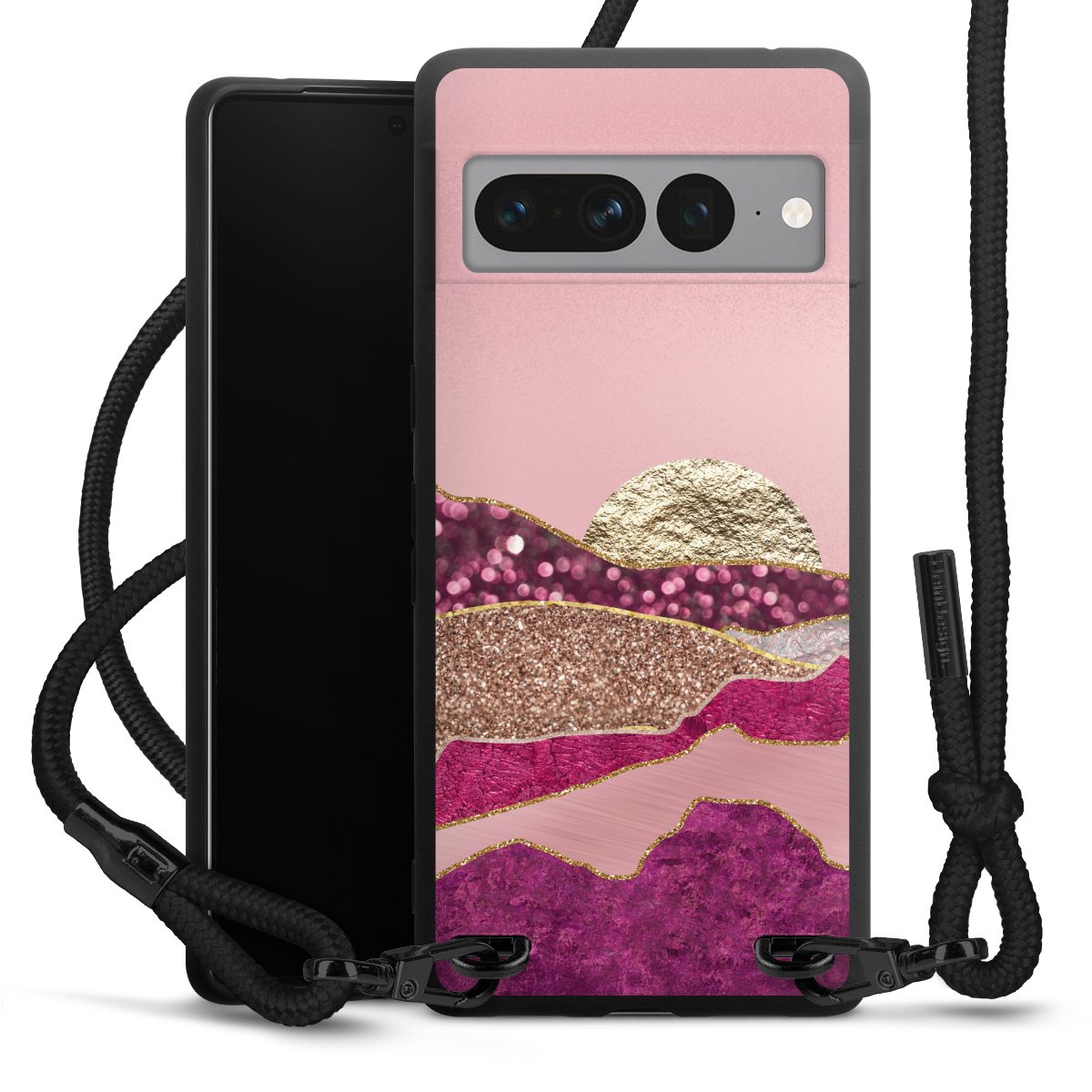 We use the solid direct print process for this phone case, which is why the print area only covers the back and the edge remains unprinted. The case to wear around your neck can be ordered unprinted, fully printed, or partially printed. For your design, either choose one of our exclusive shop motifs or get creative and create your own design, for example with photos and overlays. Design your own personal trend accessory and make an individual statement on the streets!