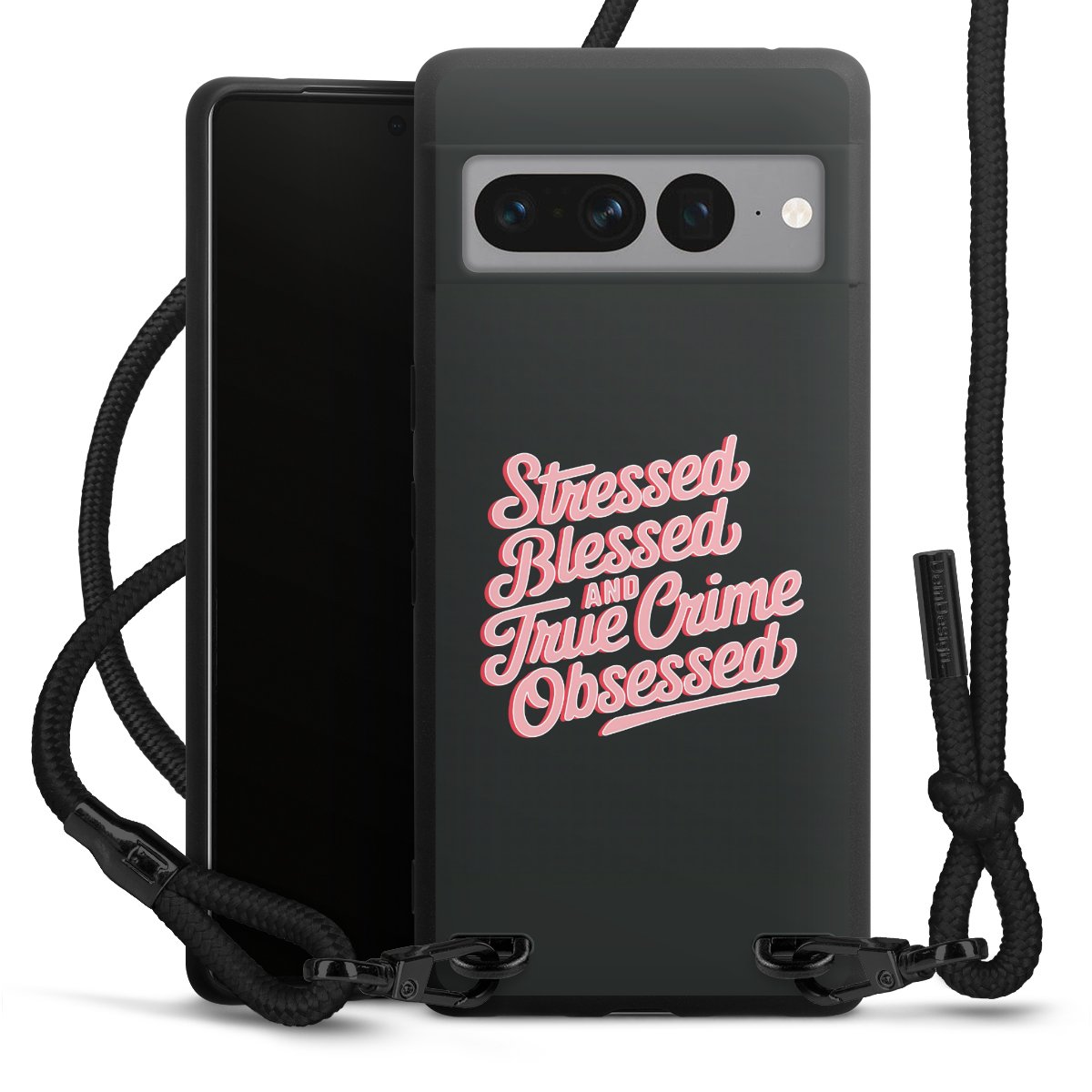 The matt black silicone case is made of flexible TPU (thermoplastic polyurethane) and offers robust protection. The durable, unbreakable material makes the cover flexible and dimensionally stable at the same time. The matte surface makes your design stand out more and is less susceptible to fingerprints and dirt. The stylish trend accessory fits comfortably in the hand and is perfectly complemented by the fabric (polyester) mobile phone strap. The braided fabric strap is approx. 1.70 metres long with a diameter of approx. 0.5 cm. Due to the special knotting technique, the length of the strap can be adjusted by simply pulling it, so that you can adapt it individually to your wishes. The practical case to wear around your neck is available with the fabric strap in black. As a little icing on the cake, we have provided the strap with a chic metal fastener in matt black. The strap is securely fastened to the case with loops made of high-quality genuine leather and press studs. The ends of the fabric strap are covered with metallic end caps and thus protected from fraying.