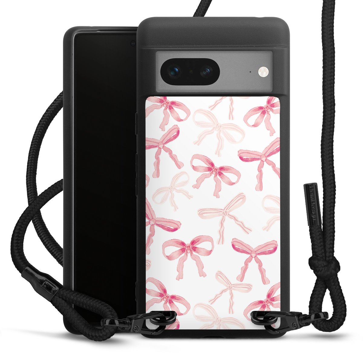 The matt black silicone case is made of flexible TPU (thermoplastic polyurethane) and offers robust protection. The durable, unbreakable material makes the cover flexible and dimensionally stable at the same time. The matte surface makes your design stand out more and is less susceptible to fingerprints and dirt. The stylish trend accessory fits comfortably in the hand and is perfectly complemented by the fabric (polyester) mobile phone strap. The braided fabric strap is approx. 1.70 metres long with a diameter of approx. 0.5 cm. Due to the special knotting technique, the length of the strap can be adjusted by simply pulling it, so that you can adapt it individually to your wishes. The practical case to wear around your neck is available with the fabric strap in black. As a little icing on the cake, we have provided the strap with a chic metal fastener in matt black. The strap is securely fastened to the case with loops made of high-quality genuine leather and press studs. The ends of the fabric strap are covered with metallic end caps and thus protected from fraying.