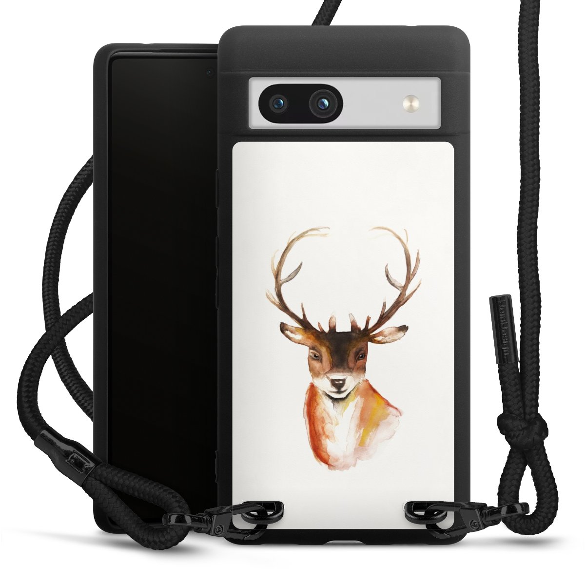 The matt black silicone case is made of flexible TPU (thermoplastic polyurethane) and offers robust protection. The durable, unbreakable material makes the cover flexible and dimensionally stable at the same time. The matte surface makes your design stand out more and is less susceptible to fingerprints and dirt. The stylish trend accessory fits comfortably in the hand and is perfectly complemented by the fabric (polyester) mobile phone strap. The braided fabric strap is approx. 1.70 metres long with a diameter of approx. 0.5 cm. Due to the special knotting technique, the length of the strap can be adjusted by simply pulling it, so that you can adapt it individually to your wishes. The practical case to wear around your neck is available with the fabric strap in black. As a little icing on the cake, we have provided the strap with a chic metal fastener in matt black. The strap is securely fastened to the case with loops made of high-quality genuine leather and press studs. The ends of the fabric strap are covered with metallic end caps and thus protected from fraying.