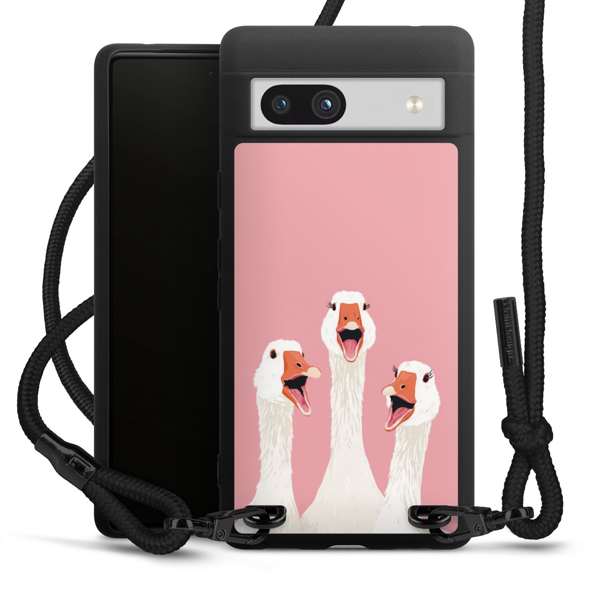 The matt black silicone case is made of flexible TPU (thermoplastic polyurethane) and offers robust protection. The durable, unbreakable material makes the cover flexible and dimensionally stable at the same time. The matte surface makes your design stand out more and is less susceptible to fingerprints and dirt. The stylish trend accessory fits comfortably in the hand and is perfectly complemented by the fabric (polyester) mobile phone strap. The braided fabric strap is approx. 1.70 metres long with a diameter of approx. 0.5 cm. Due to the special knotting technique, the length of the strap can be adjusted by simply pulling it, so that you can adapt it individually to your wishes. The practical case to wear around your neck is available with the fabric strap in black. As a little icing on the cake, we have provided the strap with a chic metal fastener in matt black. The strap is securely fastened to the case with loops made of high-quality genuine leather and press studs. The ends of the fabric strap are covered with metallic end caps and thus protected from fraying.