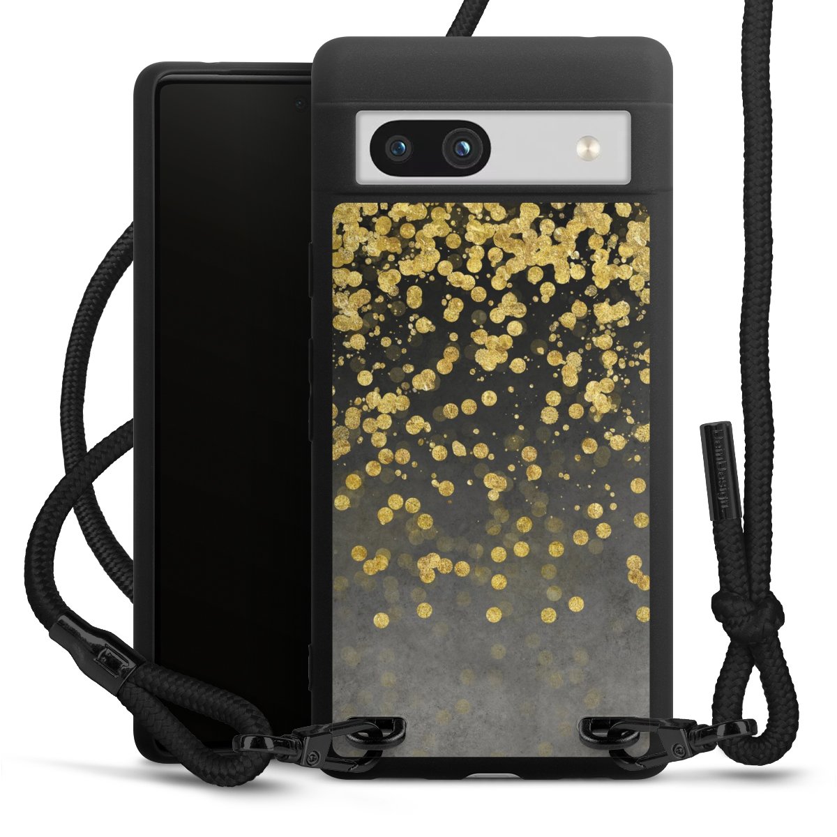 The matt black silicone case is made of flexible TPU (thermoplastic polyurethane) and offers robust protection. The durable, unbreakable material makes the cover flexible and dimensionally stable at the same time. The matte surface makes your design stand out more and is less susceptible to fingerprints and dirt. The stylish trend accessory fits comfortably in the hand and is perfectly complemented by the fabric (polyester) mobile phone strap. The braided fabric strap is approx. 1.70 metres long with a diameter of approx. 0.5 cm. Due to the special knotting technique, the length of the strap can be adjusted by simply pulling it, so that you can adapt it individually to your wishes. The practical case to wear around your neck is available with the fabric strap in black. As a little icing on the cake, we have provided the strap with a chic metal fastener in matt black. The strap is securely fastened to the case with loops made of high-quality genuine leather and press studs. The ends of the fabric strap are covered with metallic end caps and thus protected from fraying.
