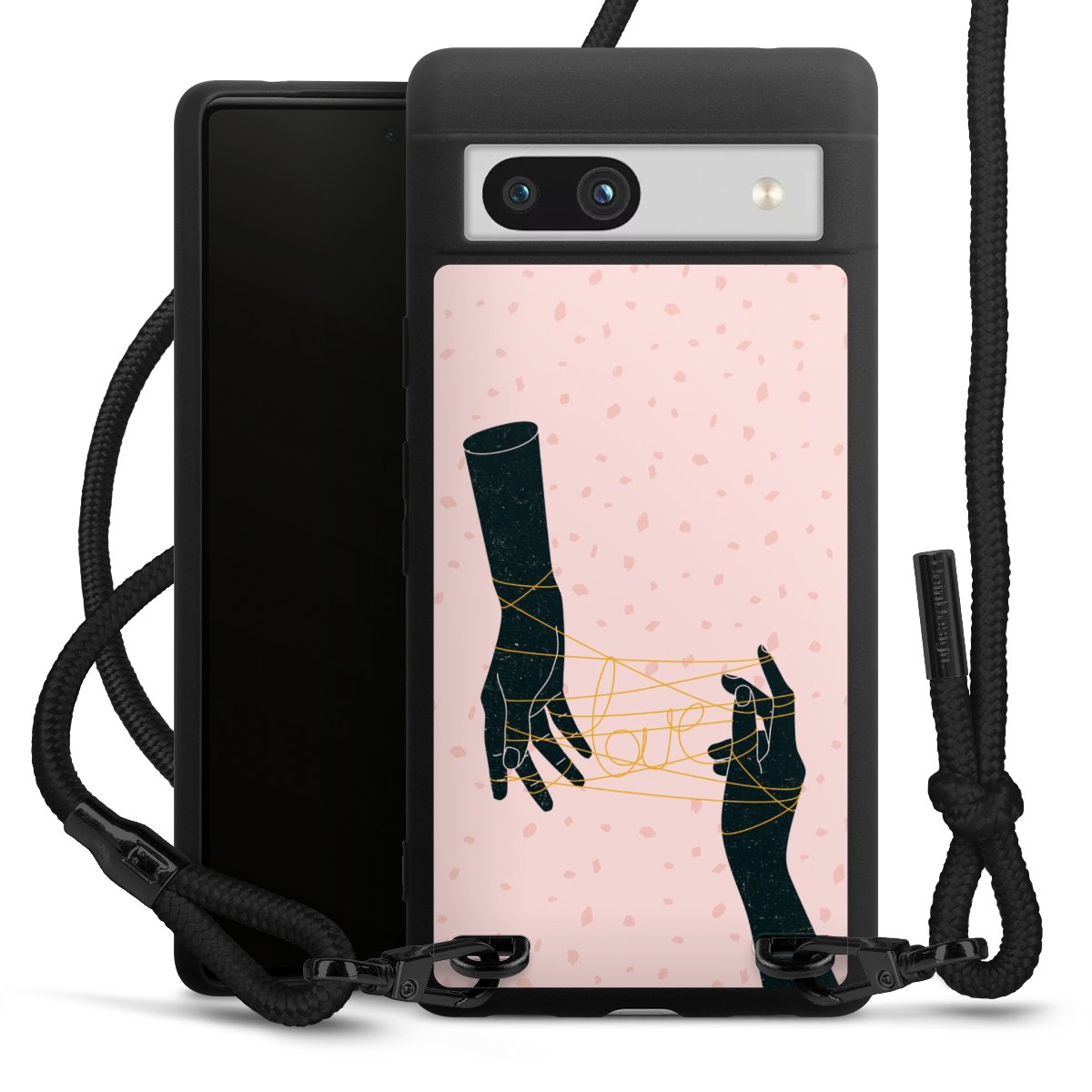 The matt black silicone case is made of flexible TPU (thermoplastic polyurethane) and offers robust protection. The durable, unbreakable material makes the cover flexible and dimensionally stable at the same time. The matte surface makes your design stand out more and is less susceptible to fingerprints and dirt. The stylish trend accessory fits comfortably in the hand and is perfectly complemented by the fabric (polyester) mobile phone strap. The braided fabric strap is approx. 1.70 metres long with a diameter of approx. 0.5 cm. Due to the special knotting technique, the length of the strap can be adjusted by simply pulling it, so that you can adapt it individually to your wishes. The practical case to wear around your neck is available with the fabric strap in black. As a little icing on the cake, we have provided the strap with a chic metal fastener in matt black. The strap is securely fastened to the case with loops made of high-quality genuine leather and press studs. The ends of the fabric strap are covered with metallic end caps and thus protected from fraying.